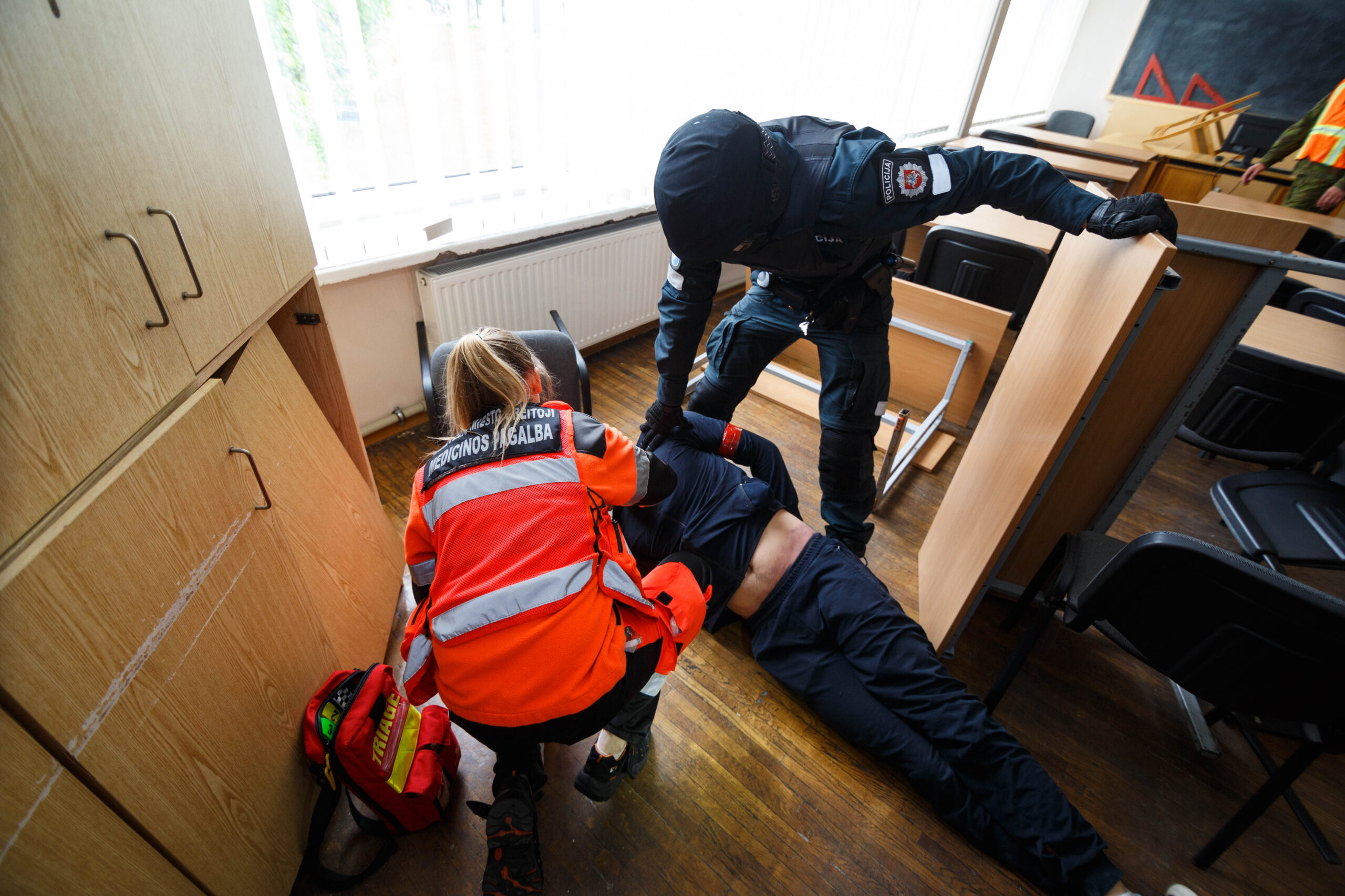 Suplanuota taip, kad keli nežinomi ginkluoti asmenys įsibrauna į kolegiją ir pradeda šaudyti. Iškviesti greitosios medikai ir policijos pareigūnai. Sužeistųjų buvo ir lauke, ir viduje. Vos medikams pajudėjus į pastatą, pasigirdo šūviai. Jei įvykiai būtų realūs, būtų nukentėję ir jie – nepaisydami šūvių drąsiai ėjo link pastato. Skubiai atvykę ginkluoti pareigūnai bandė įeiti į pastatą, jiems tai padaryti pavyko. Veiksmas persikėlė į antrą aukštą, ten buvo ginkluotų žmonių ir studentų, paimtų įkaitais, taip pat garsiai rėkiančių, prašančių pagalbos sužeistųjų. Incidentas baigėsi įtariamųjų sulaikymu, sužeistuosius išgabeno karo medikai. Kiek ir kokių klaidų padaryta ir ar jų apskritai buvo pratybų metu, paaiškės vėliau viską įvertinus.
