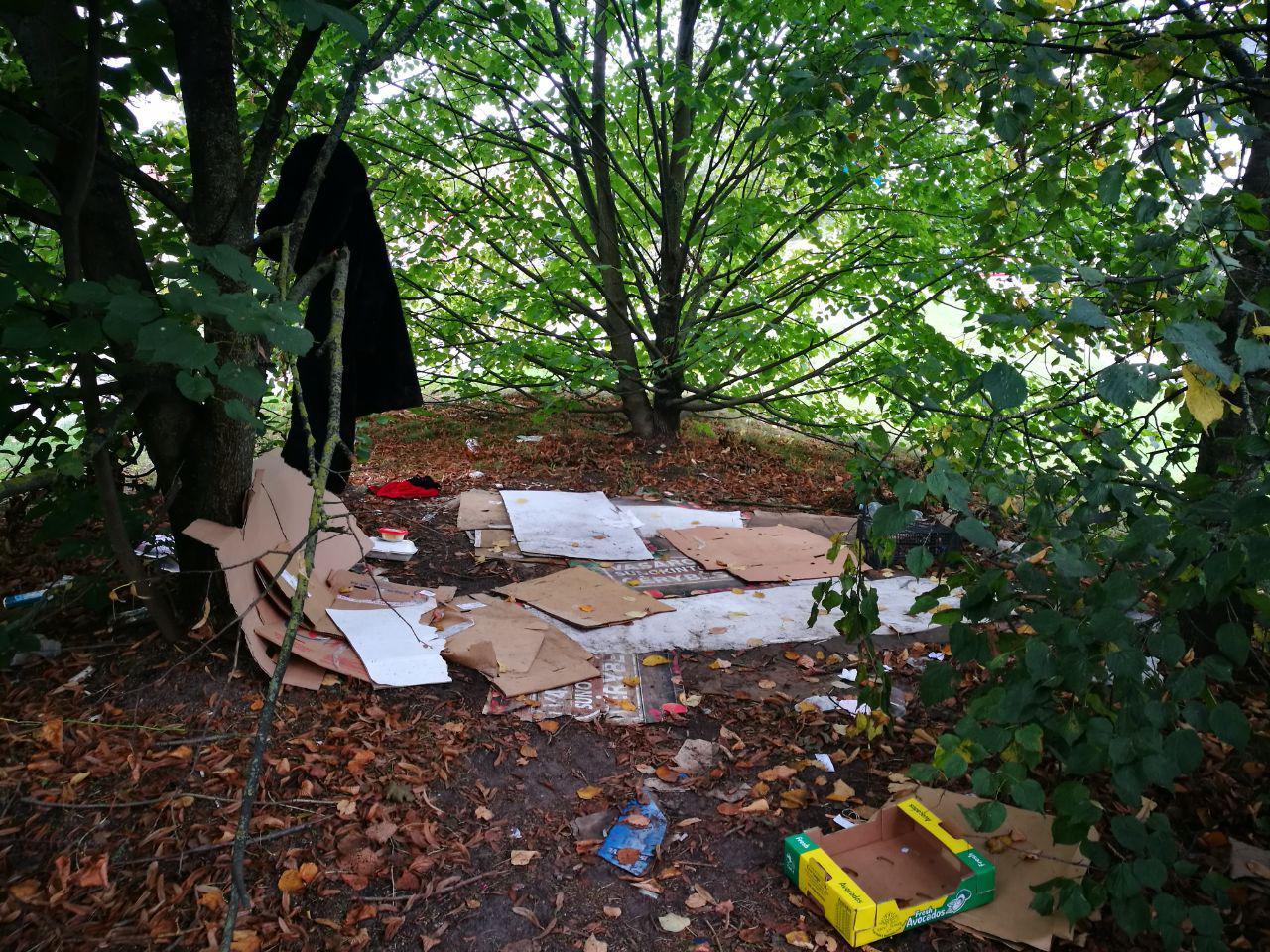 Čia saugų prieglobstį Nevėžio upės fone atradę nuolatinės gyvenamosios vietos neturintys asmenys. Kiek jų glaudžiasi lapais apžėlusiuose krūmuose, nėra aišku. Tačiau iš kartoninių dėžių lakštų, ištiestų po visais krūmais, akivaizdu, jog vietos užtektų vienam ar dviem gyventojams. Čia pat mėtosi vienkartinės maisto dėžutės, nešvarūs apatiniai drabužiai, o ant storesnės šakos išdidžiai užkabinti tamsūs moteriški kailiniai. Tačiau sulaukti žiemos, net ir turint nuo nemenko šalčio apsaugančius apdarus, panašu, nepavyks. Tokia kaimynystė Panevėžio centro gyventojų nedžiugina.