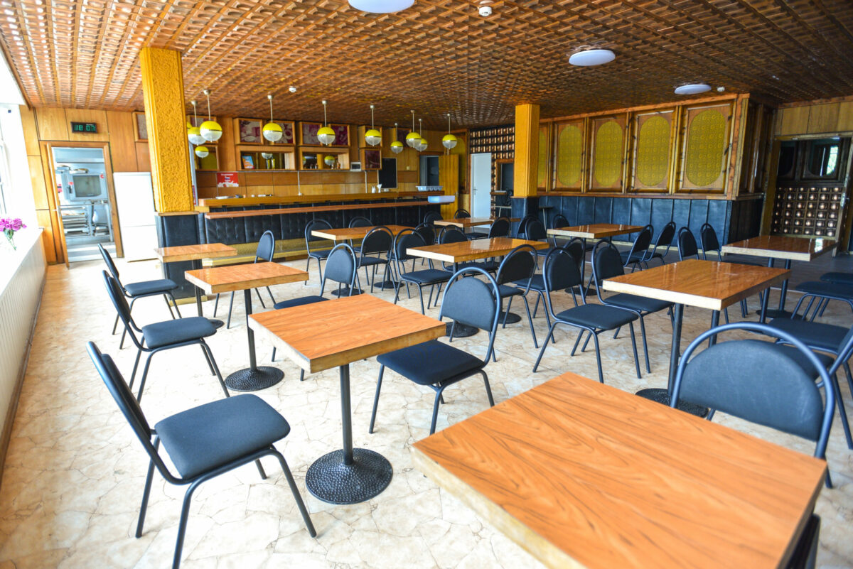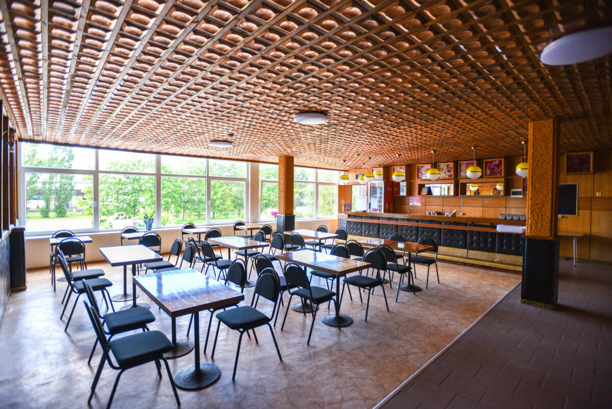 Joje liko tos pačios durys, anuomet prabangiai atrodžiusios lubos, tas pats baras, tie patys stalai, prie kurių pietaudavo didžiulės gamyklos administracija, čia netgi laiką skaičiuoja tas pats, vis dar veikiantis elektroninis laikrodis.