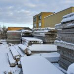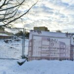 Statybvietę juosia segmentinė tvora, kai kur ji jau apgadinta. Aptvertoje zonoje želia aukštos piktžolės, styrančios net iš po sniego.