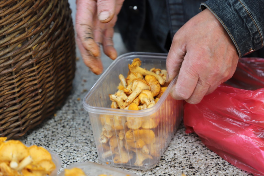Voveraičių indelį jis siūlo už keturis eurus. Prieš pradėdamas prekiauti apsižiūrėjo, kad vienas prekeivis tokį pat indelį grybų pardavė už penkis, o kitas už pusę indelio prašė trijų eurų.