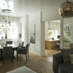 Klasikinė priemonė vizualiai praplėsti erdves bei sukurti harmoniją per interjero elementų pasikartojimą atspindžiuose– veidrodžiai. Veidrodžių gausa svetainėje transformuoja nuobodžią stačiakampę erdvę, išplečia ją, sukuria naujų netikėtų rakursų.