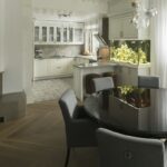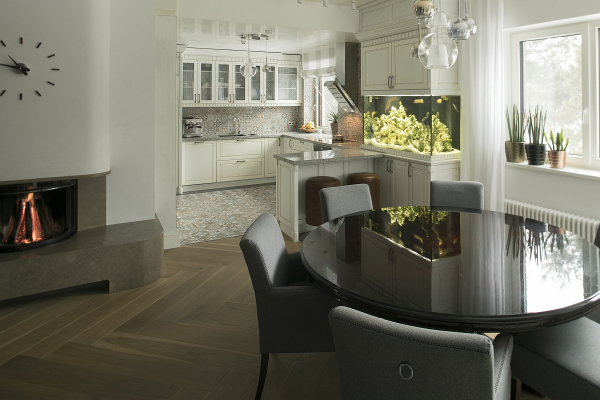 Gana ryškus akvariumo akcentas žymi virtuvės ir valgomojo erdvių ribą.