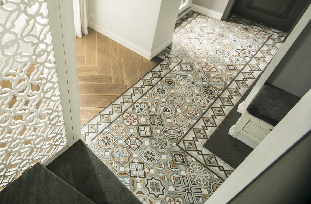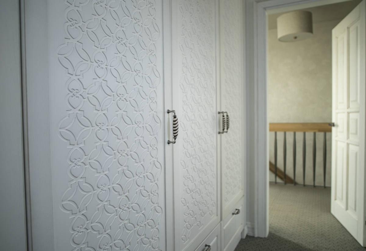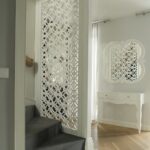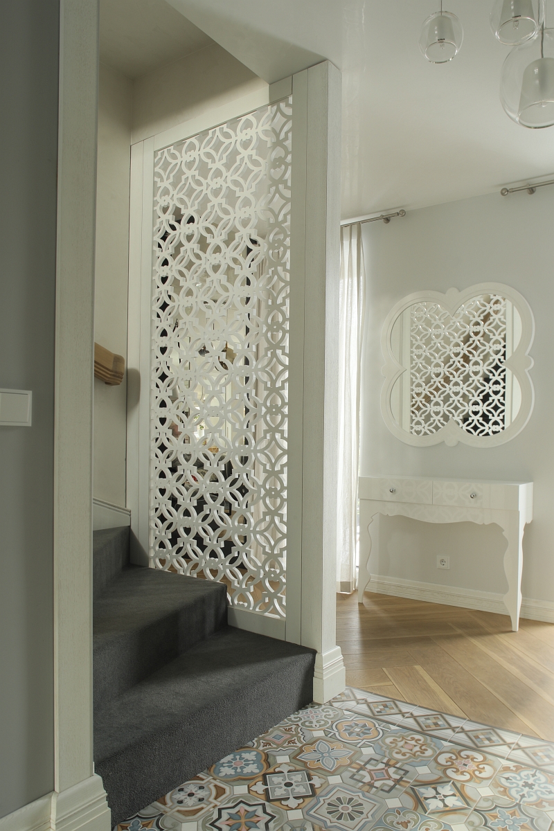 Pavyzdžiui, klientai pageidavo, kad dėl vaikų saugumo laiptai būtų uždari. Visai uždengti laiptinės architektei nesinorėjo, todėl buvo suprojektuota balta ažūrinė sienelė, savo raštu primenanti plyteles ir lėmusi bendrą dekoratyvinių elementų stilistiką. Šią ornamentiką buvo nuspręsta pakartoti miegamojo spintos ir prieškambario baldų apdailoje.