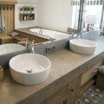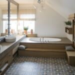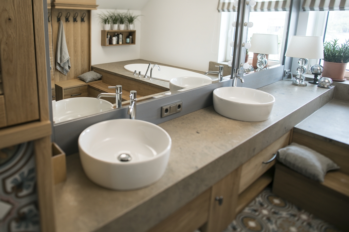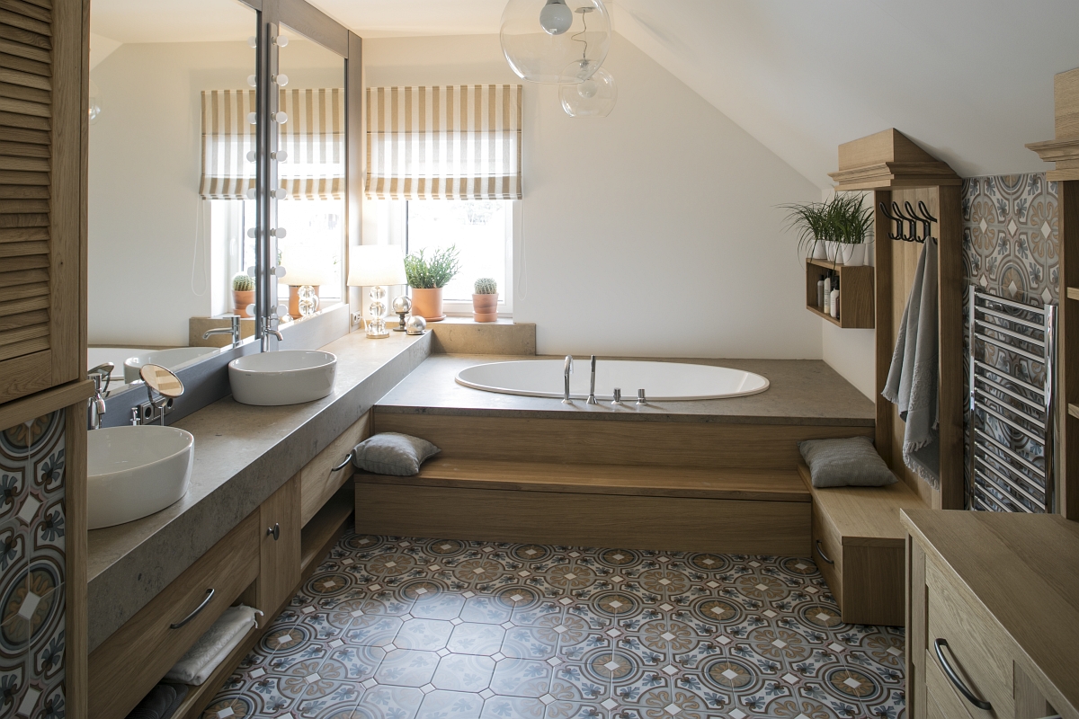 Žinoma, klasika galima laikyti ir interjero medžiagų pasirinkimą. Vonios kambario baldai – iš natūralaus ąžuolo masyvo, o stalviršiams panaudotas akmuo: į akmens plokštę įleista vonia, ant tokio pat stalviršio sumontuota praustuvė. Virtuvės stalviršiams parinktas praktiškas margas granitas, baldams – baltai dažyto ąžuolo masyvas taip pat žada tvarumą.