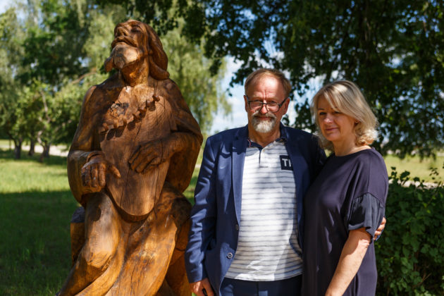 Molainių kaimo bendruomenės pirmininkas Erlandas Janėnas ir bibliotekos darbuotoja Loreta Gečienė prie Molainių paminėjimo 650 metinėms pastatyto paminklo.