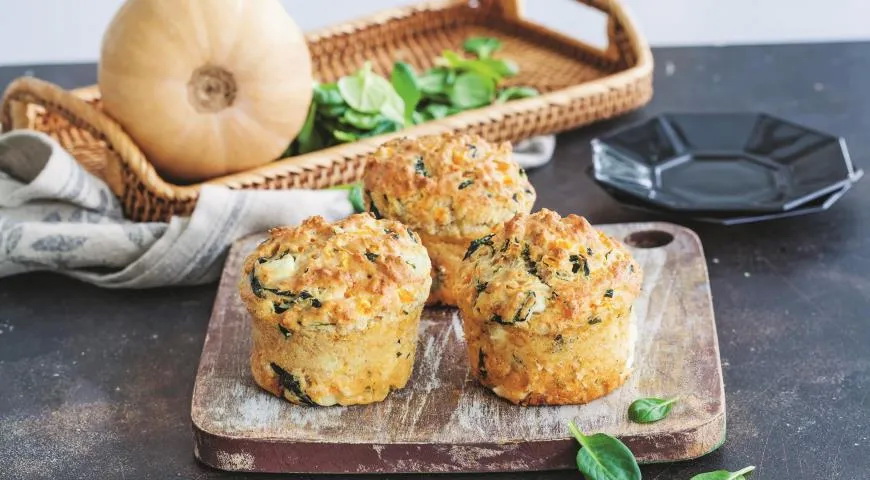 Reikės (12 porcijų): 350 g moliūgo, 125 g šaldytų smulkintų (arba 100 g šviežių) špinatų, 2 kiaušinių, 1 stiklinės pieno, 100 g fetos sūrio, 150 g tarkuoto parmezano sūrio, 280 g miltų, 4 šaukštelių kepimo miltelių, druskos, šviežiai maltų juodųjų pipirų.