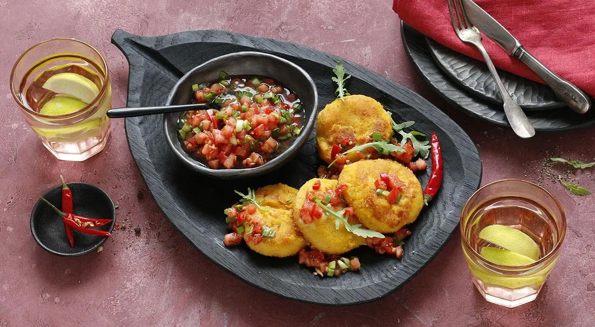 Reikės (4 porcijoms): kotletams: 200 g avinžirnių, 0,5 šaukštelio šviežiai maltų juodųjų pipirų, 0,25 šaukštelio Kajeno paprikos, 400 g moliūgo minkštimo, 1/3 stiklinės maltų džiūvėsių (ir dar šiek tiek – apvolioti), 3 česnako skiltelių, 1 šaukšto citrinų sulčių, 1 kiaušinio, 1 šaukšto rudojo cukraus, 0,25 šaukštelio cinamono, 1 šaukšto kario, 2 šaukštelių kumino; padažui: 0,5 aitriosios paprikos, 2 svogūno laiškų, 0,5–1 šaukštelio citrinų sulčių, 2 nedidelių pomidorų, 2 šaukštų alyvuogių aliejaus, druskos, šviežiai maltų juodųjų pipirų.