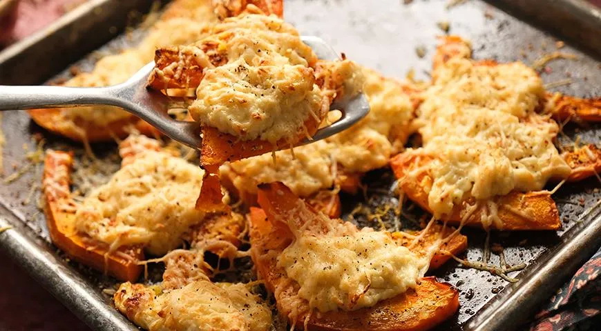 Ištraukite skardą iš orkaitės, sustumkite moliūgo skilteles vieną prie kitos. Ant viršaus paskleiskite sūrio masę ir apibarstykite likusiu tarkuotu sūriu. Tada grąžinkite į orkaitę dar 20 minučių.