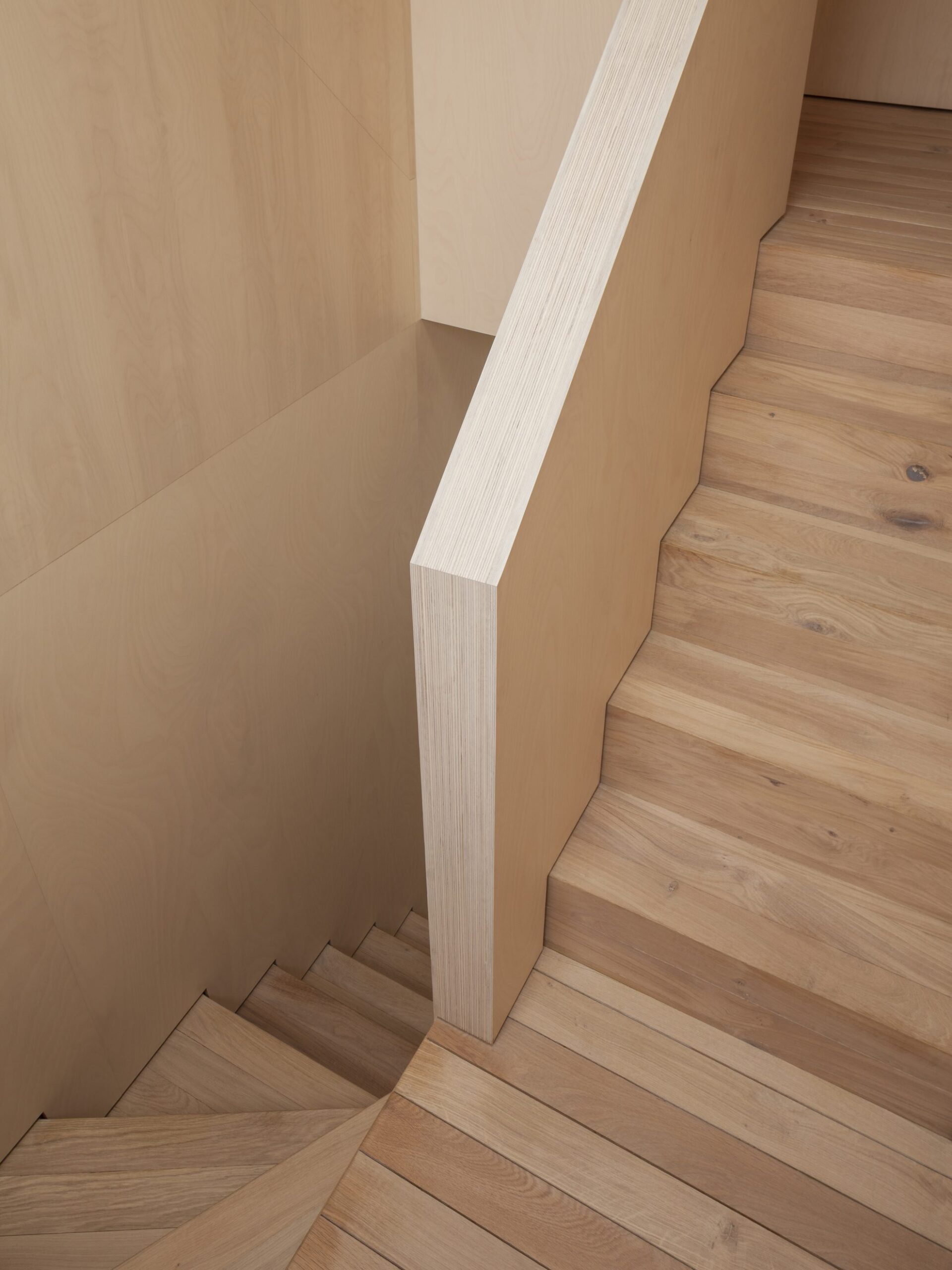 Šiame projekte K. Widgeris sėkmingai suderino ir sujungė du kontrastuojančius medienos tipus: degintą maumedį ir šviesią fanerą, taip pabrėždamas šių medžiagų individualumą. Su medžio plokšte jis „žaidžia“ skirtingus jos raštus derindamas laiptų turėkluose, durų, langų apvaduose ir sienose.