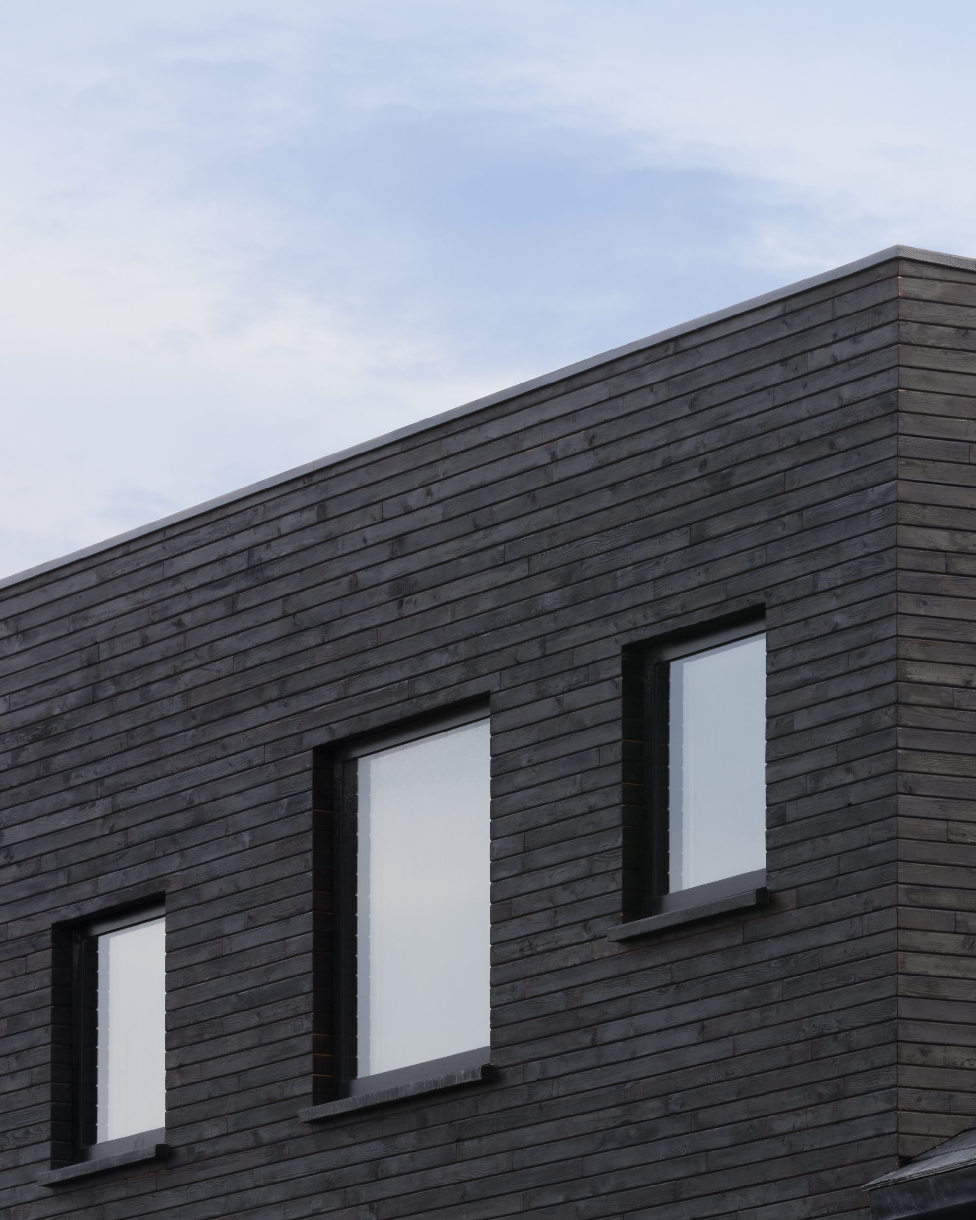 Deginto maumedžio eksterjeras subtiliai „užsuka“ ir į namelio vidų – įrėmina langus ir gražiai kontrastuoja su šviesia interjero plokšte. Architektas atkreipia dėmėsį, kad fasadui naudotą maumedį degino pats patalpų šeimininkas ir sako, kad ugnimi apdirbta mediena turi didžiulį privalumą: išorinis deginto medžio sluoksnis tampa atsparus oro poveikiui bei apsaugo vidinę dalį. Žinoma, ne mažiau svarbus ir vaizdas, nes deginto medžio fasadas tikrai išsiskiria iš aplikos.