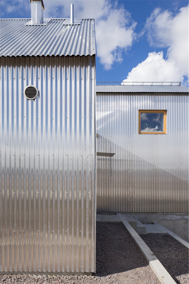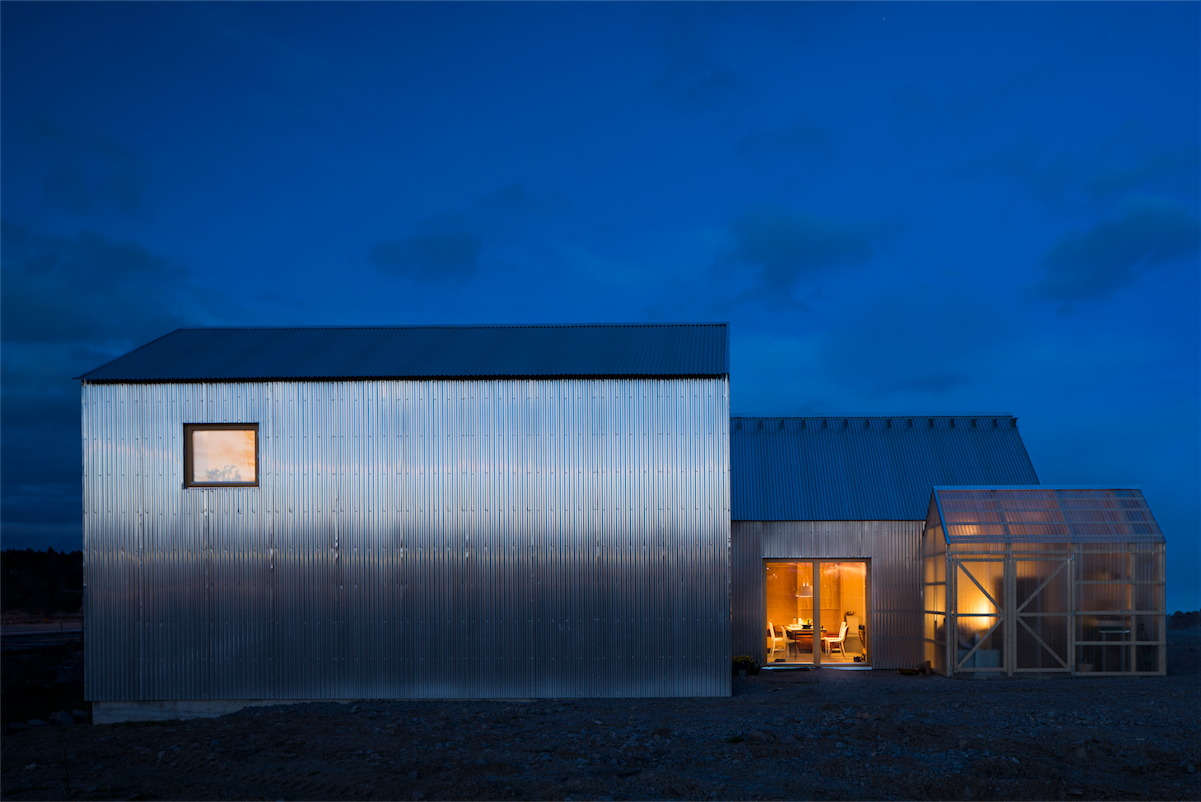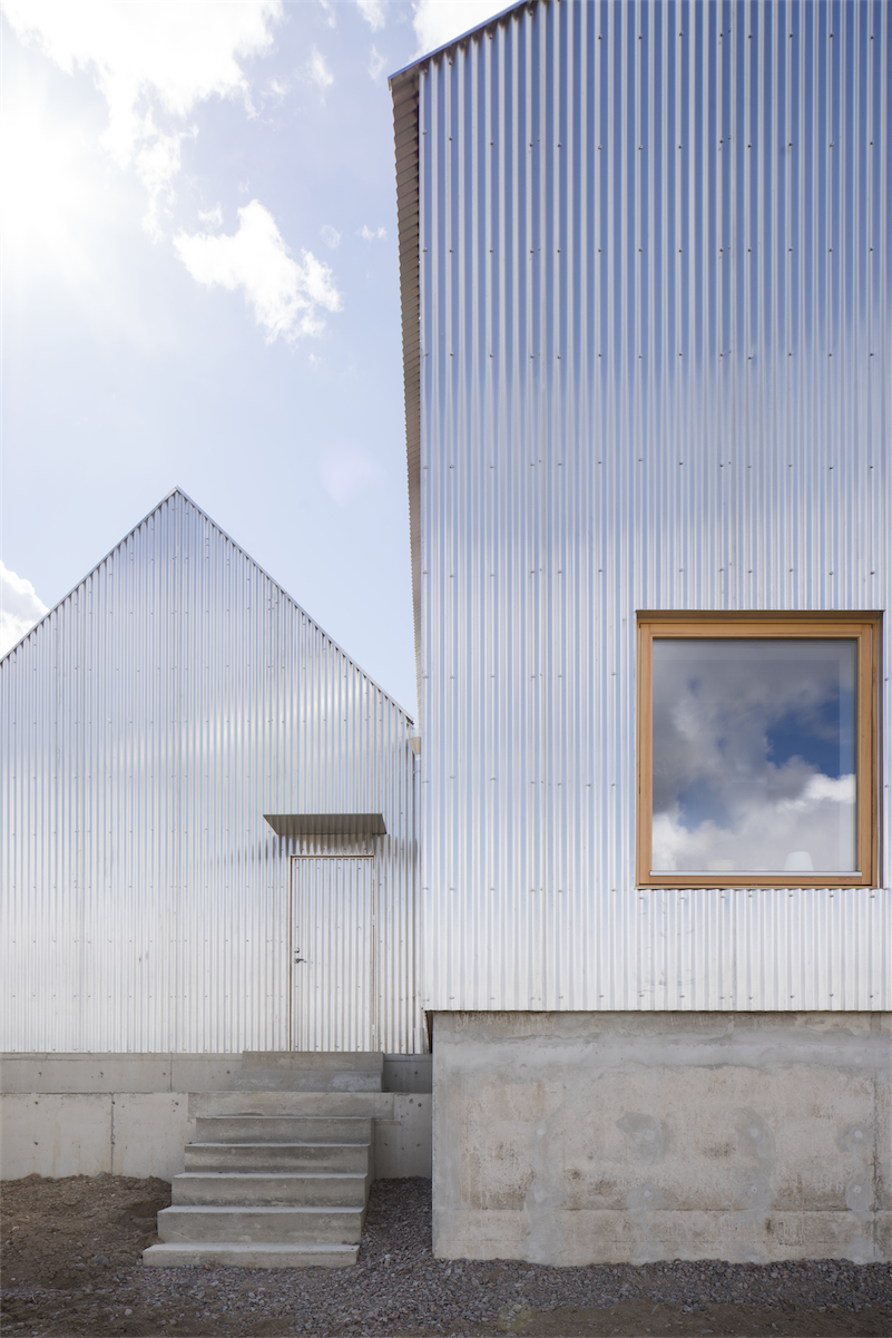 Dviejų blokų pastatas – tai pirmasis vos 2015 metais įkurtos švedų architektūros ir dizaino įmonės „Förstberg Ling“, dviejų jaunų architektų – Björno Förstbergo ir Mikaelio Lingo – projektas, nuolatinė Björno mamos Marios, audėjos ir bibliotekininkės, gyvenamoji buveinė ir darbo studija. Naująjį projektą architektai taip ir pavadino – „Namas mamai“. Neapdailintas betoninis pamatas, iškeliantis namą, dar labiau išryškina metalo blizgesį. Gryno gofruoto aliuminio fasadas ir stogas sukelia pagal paros metą bei sezoną kintantį spalvų, šviesos ir šešėlių žaismą, atspindėdamas tykius apylinkių vaizdus.