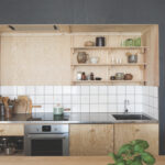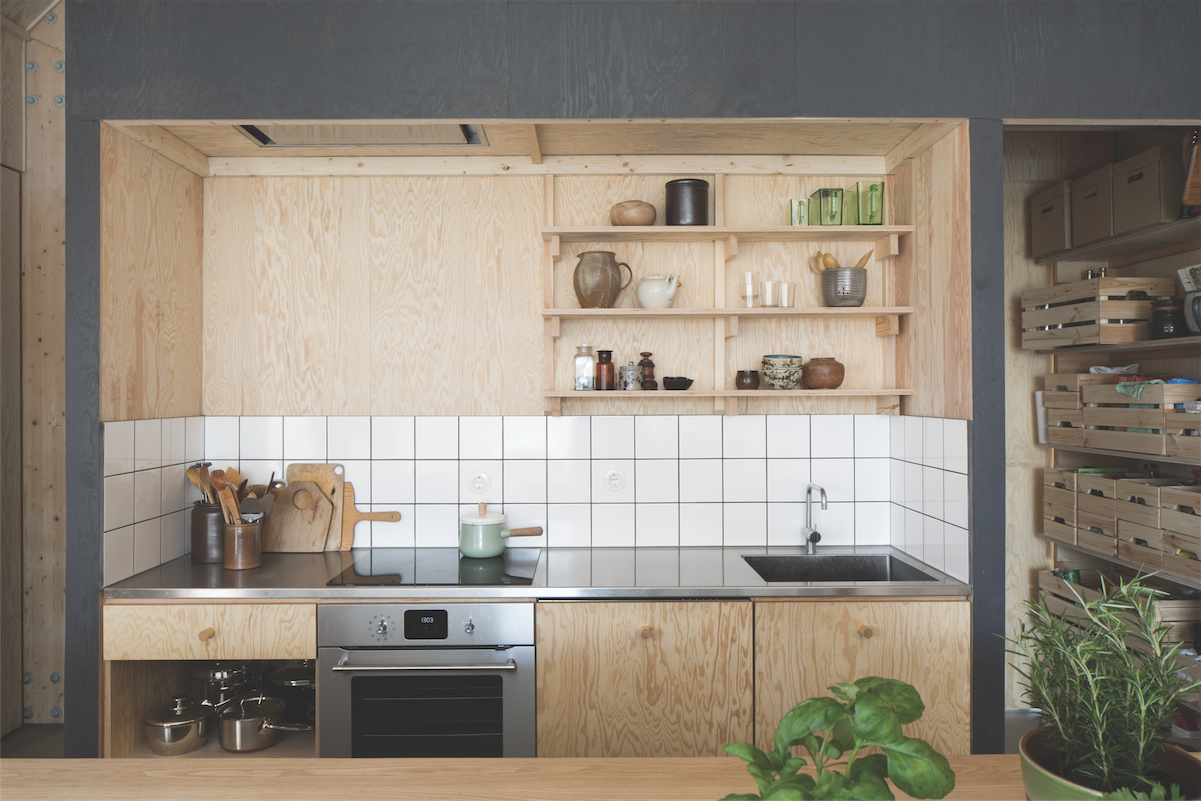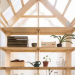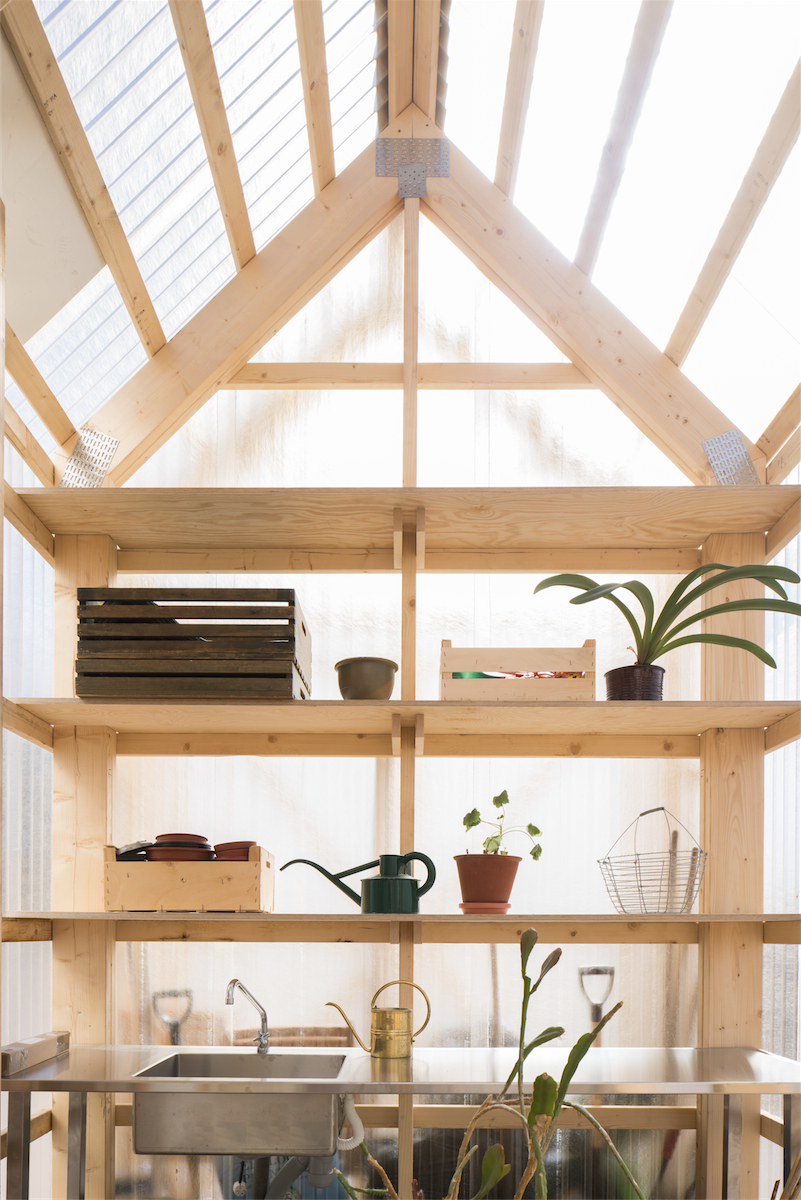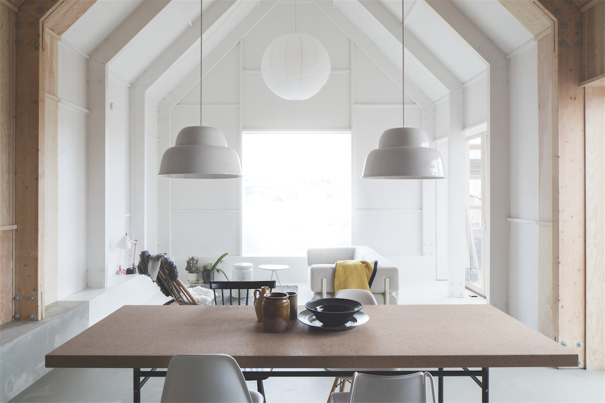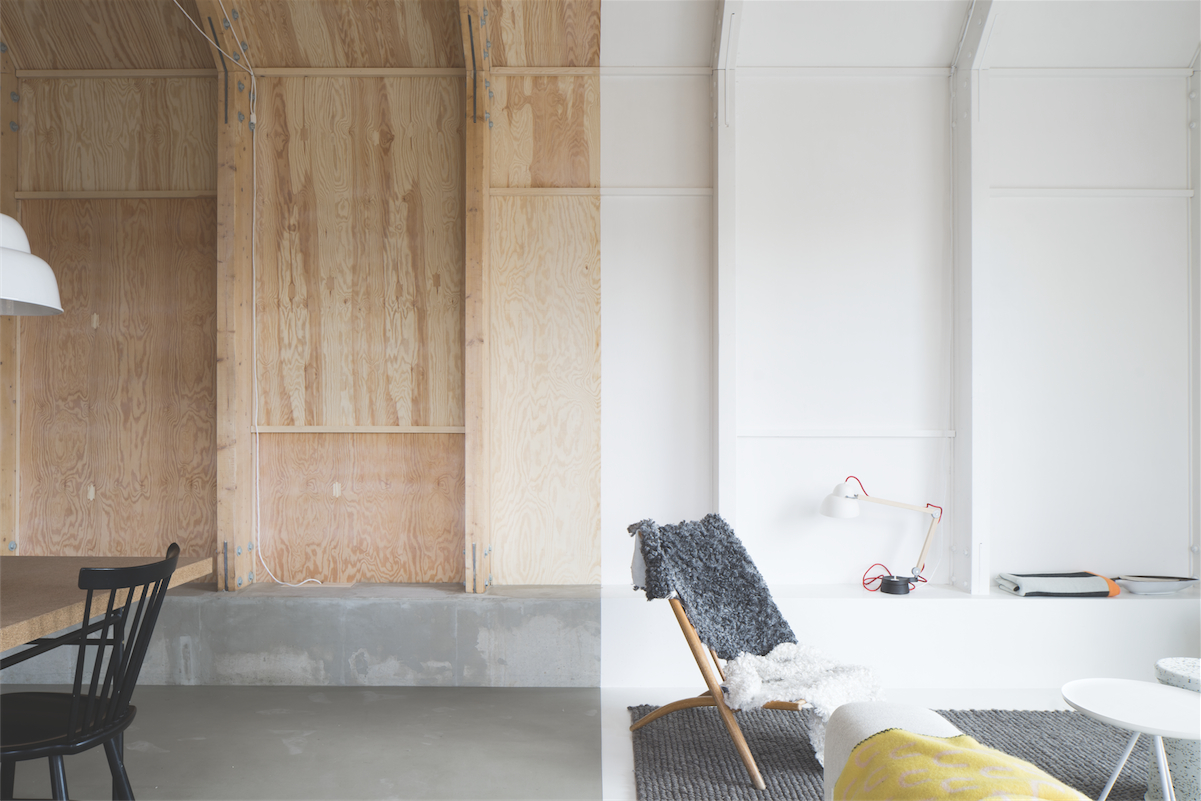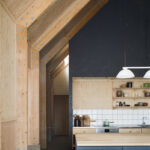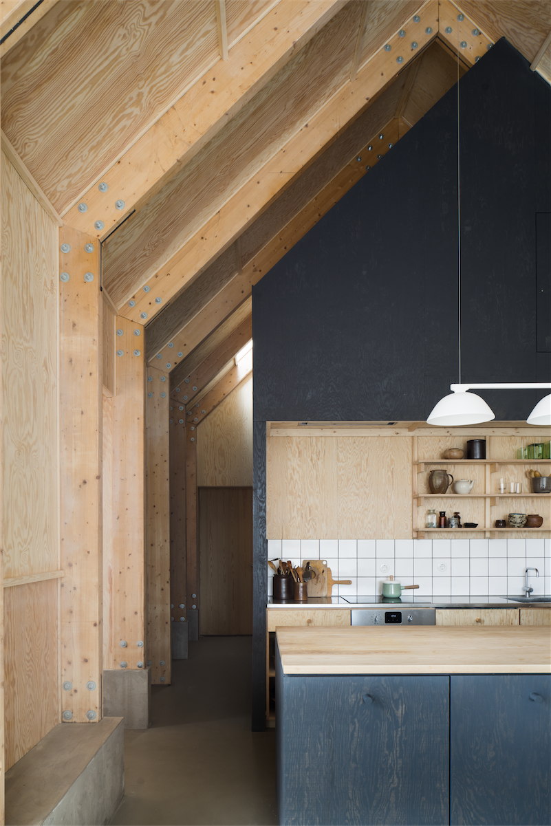 Akivaizdi užuomina į ūkinių pastatų architektūrą – atviros medinės sijos ir gegnės. Sienos, padengtos fanera, pripildo erdvę skandinaviškos šilumos. Fanera daug kur palikta natūrali, padengta bespalviu aliejumi, o svetainėje, koridoriuje ir svečių miegamajame nudažyta baltai. Architektai tikisi, kad vyraujančios baltos spalvos interjerui negresia virsti sterilios ligoninės aplinka, nes laikui bėgant jį padengs natūrali patina.