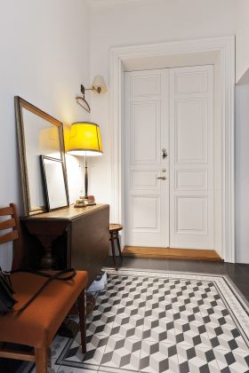 Pirmykštį šios erdvės vaizdą sunku įsivaizduoti dabar, žvalgantis iki menkiausios detalės apgalvotuose namuose. Senoviniuose interjeruose matomos medinės grindys, dvivėrės durys, subtilios ir saikingos gipso dekoro detalės, netgi senoviniai jungikliai gali suklaidinti: atrodo, kad naujakuriams šią erdvę tereikėjo užpildyti baldais. Iš tiesų buvo priešingai: visos šios detalės apgalvotos ir sukurtos arba įlietos į interjerą naujai, pavyzdžiui, senovinių jungiklių įsigyti šeimininkai intensyviai ieškojo maždaug porą mėnesių. I. Folk juokiasi prisiminusi, kad jau įsikūrus namuose vienas bičiulis atėjęs apsižvalgė ir nustebo: grindys juk paliktos autentiškos, durys – taip pat, net jungiklių nereikėjo keisti, tai ir remonto darbų neturėjo būti daug. „Be abejo, man toks jo įspūdis – komplimentas. Sakyčiau, kad buto „vokas“ – grindys, lubos, apvadai, durys – yra duoklė namui, jo istorijai. Norėjome, kad matytųsi, jog tai šimtametis pastatas. O tokioje erdvėje interjerą galėtum jau daryti kokį nori“, – pasakojo architektė.