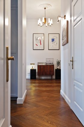 Minėtam laikotarpiui atstovauja ir dauguma bute esančių apšvietimo šaltinių. „Mudu su Ieva tokie „kurmiukai“ – vis ieškome ko gražaus, ko nors, kas patraukia širdį, – šypteli T. Kazakevičius ir pamąstęs priduria: – Mano mamos namuose vyrauja XX a. pradžios stilistika. Susidaręs įspūdis, kad jai rasti baldų ir interjero detalių yra lengviau nei mums, nes mus domina vėlesni dešimtmečiai. Atrodo, kad tuo laikotarpiu gaminti baldai, šviestuvai dažnai vėliau tiesiog išmetami.“