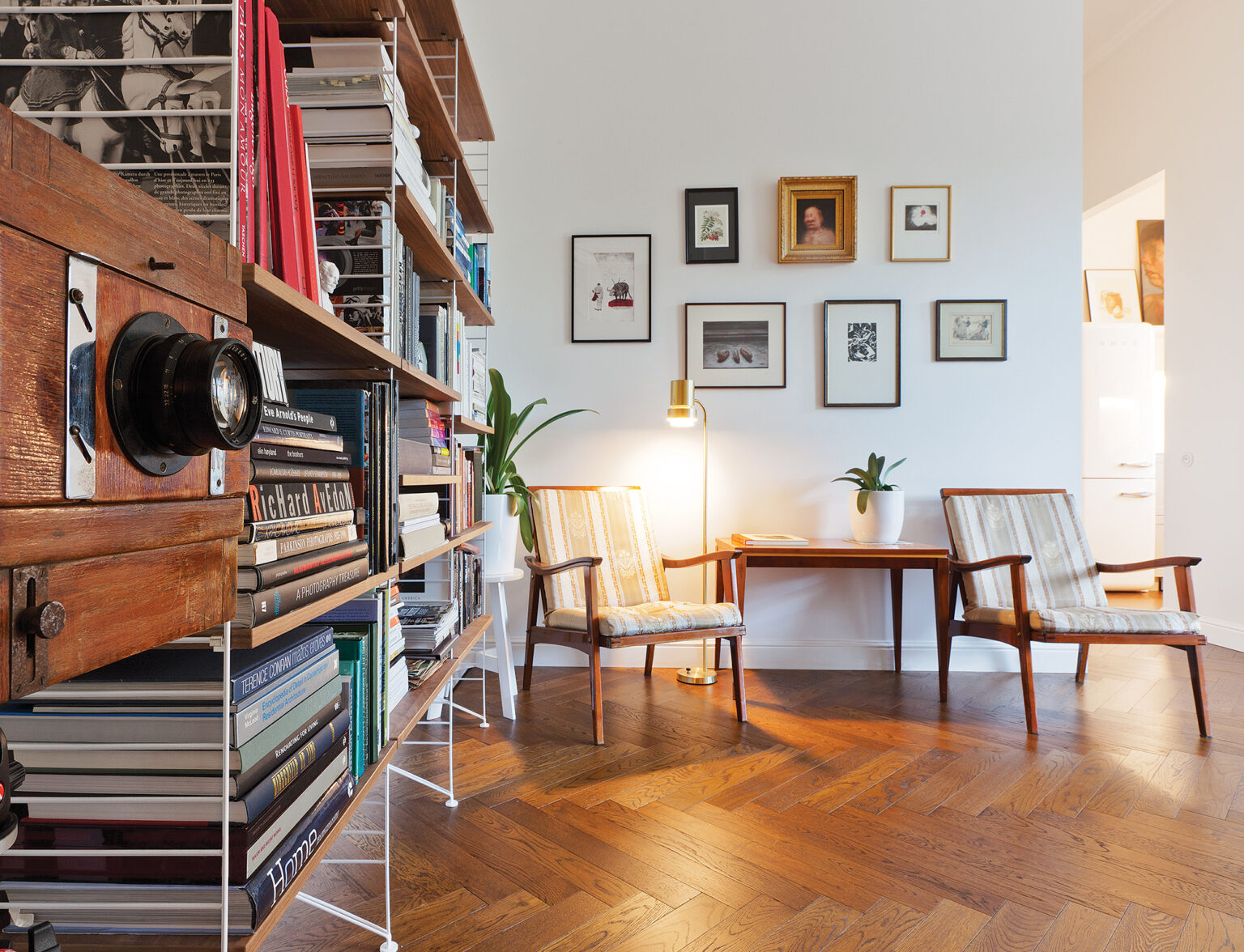 Pasižvalgius po vilniečių namus nekyla klausimų, kuo jie gyvena ar ką veikia laisvalaikiu. Sienas puošiantys meno kūriniai liudija neretus poros vizitus į meno galerijas. Tapybos ir grafikos darbams rasta vietos visuose namuose, netgi virtuvėje. Švedų gamintojo „String furniture“ knygų lentynoje guli dešimtys knygų ir albumų, dauguma jų – fotografijos srities. Aistrą fotografijai išduoda ir galiniame kambaryje esančioje indaujoje eksponuojami senoviniai fotoaparatai.