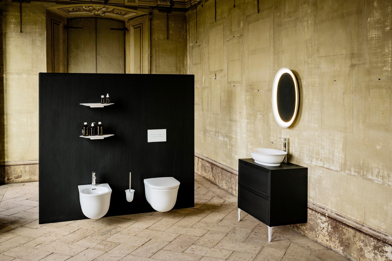 Neatsiejama šios kolekcijos dalis – žvilgsnį prikaustanti daili vonia. Įdomu, kad ji pagaminta iš kompanijos „Laufen“ sukurtos inovatyvios medžiagos „Sentec“, tačiau vizualiai puikiai dera prie „SaphirKeramik“ praustuvų.