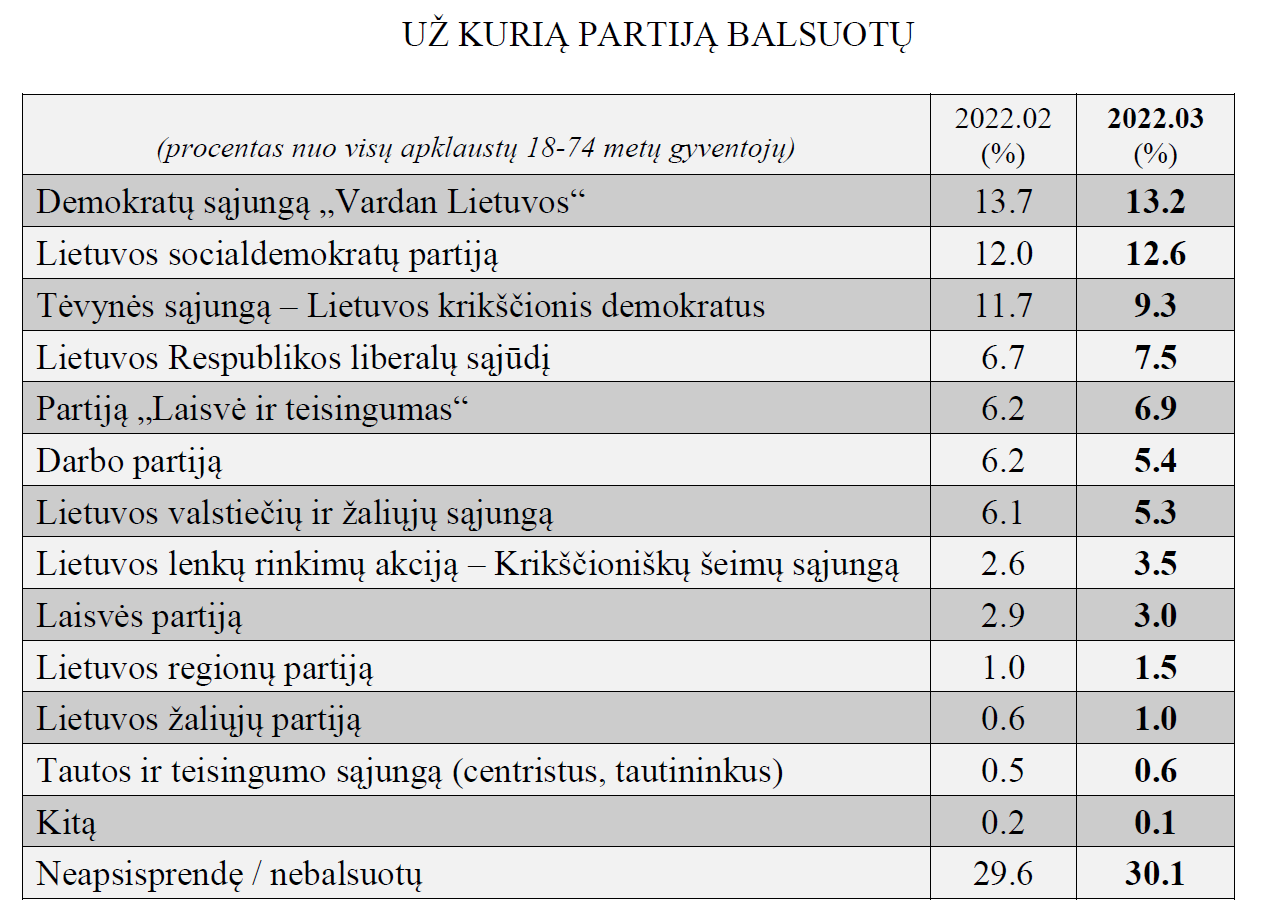 Antrą mėnesį iš eilės lydere reitingų lentelėje išlieka Sauliaus Skvernelio vedama partija „Vardan Lietuvos“. Tai, kad turi norą balsuoti už šią politinę jėgą, kovą tvirtino 13,2 proc. apklaustų respondentų. Panašiai tiek buvo ir beveik mėnesiu anksčiau darytoje apklausoje (13,7 proc. vasarį).