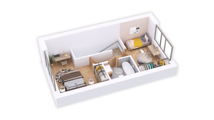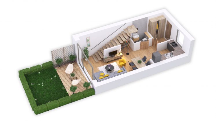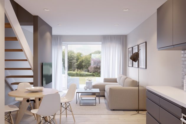 Nedidelėse būsto erdvėse komfortą užtikrins racionalūs interjero sprendimai. 56 m2 bute numatyti 3 funkcionaliai suplanuoti kambariai: pirmame aukšte numatoma svetainė su išėjimu į privatų kiemelį, virtuvės zona su valgomuoju, prieškambaris ir sanitarinis mazgas, antrame aukšte – du miegamieji ir vonios kambarys.