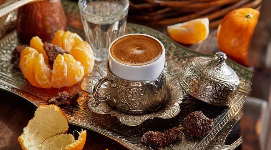 Prie tokios kavos galima patiekti džiovintų datulių ar cukruotų riešutų.