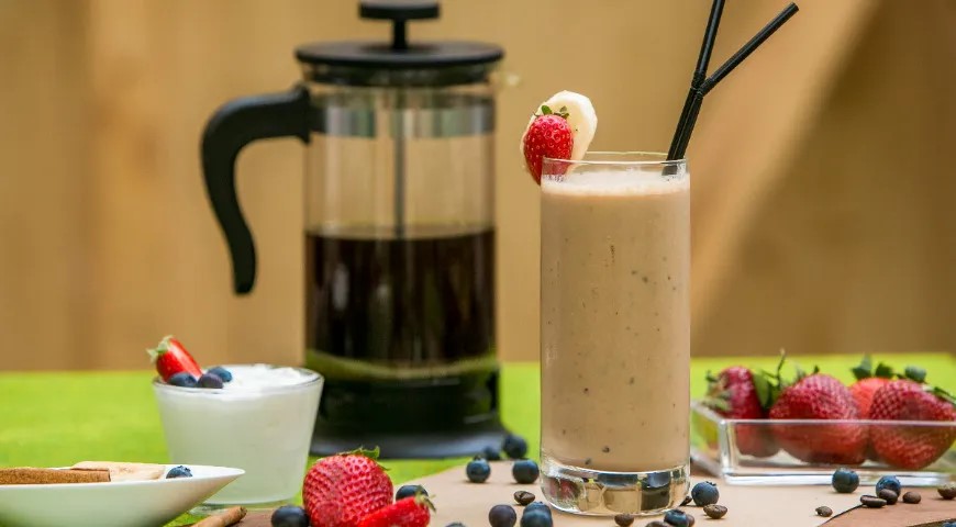 Reikės (2 porcijoms): 250 ml šviežiai virtos ir ataušintos stiprios kavos, 1 nedidelio banano, 250 ml lieso jogurto, 0,25 šaukštelio cinamono, 0,5 šaukšto natūralių nesaldintų kakavos miltelių, saujos braškių arba bet kokių sezoninių uogų.