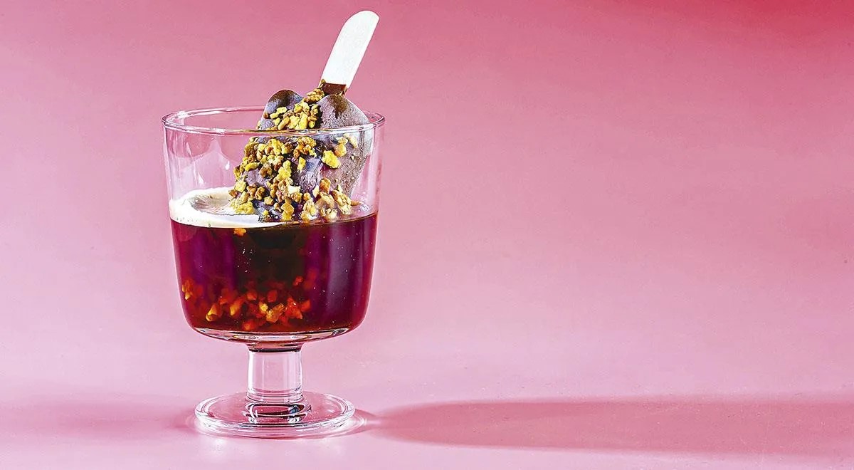 Reikės (16 porcijų): 225 g kavos, 3 litrų filtruoto vandens; sirupui: 1 stiklinės cukranendrių cukraus, 1 stiklinės vandens, 1 vanilės ankšties, žiupsnelio rūkytos jūros druskos; patiekti: 1 kg vanilinio plombyro, gazuoto vandens, rūkytos jūros druskos.