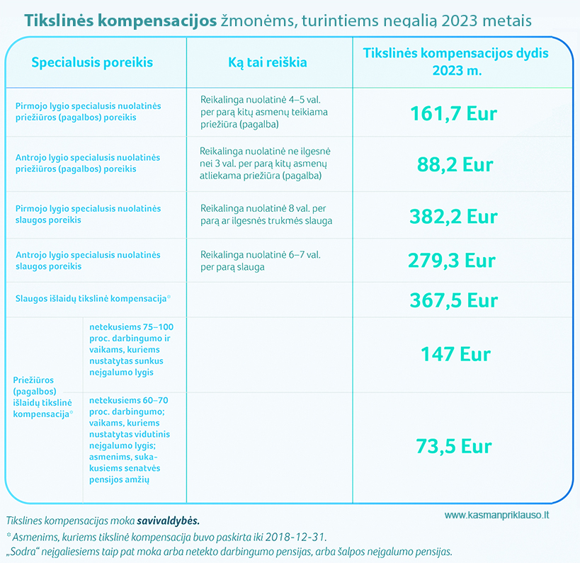 Daugiau apie neįgalių senjorų fizinės ir psichosocialinės būklės gerinimą, kompensacijos dydžius ir kitos aktualios informacijos galima rasti LR SAM ir LR SADM interneto svetainėse www.sam.lt, www.socmin.lt.