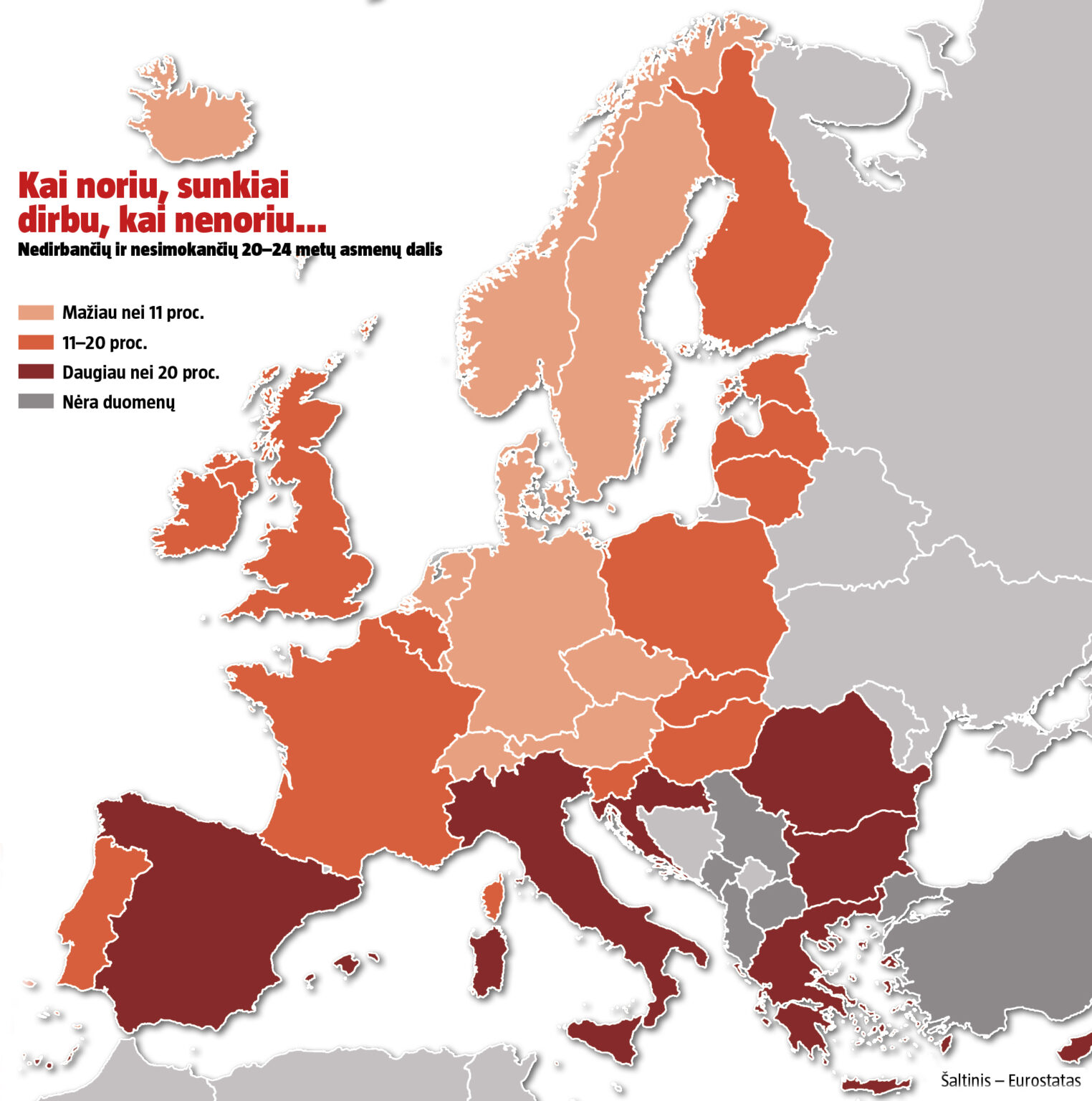 Nestudijuojančių ir nedirbančių 20–24 metų jaunuolių Lietuvoje yra 14,4 proc. Tai dvigubai daugiau negu Nyderlanduose (7,2 proc.), tačiau apie du kartus mažiau nei Italijoje (31,1 proc.). Palyginti su 2006-aisiais (13,7 proc.), padėtis šalyje beveik nepasikeitė, tačiau išaugo vienu metu ir dirbančių, ir studijuojančių asmenų skaičius. 2006 m. darbą ir mokslą suderinti bandė 9,7 proc., o 2015 m. – 14,9 proc. jaunuolių.