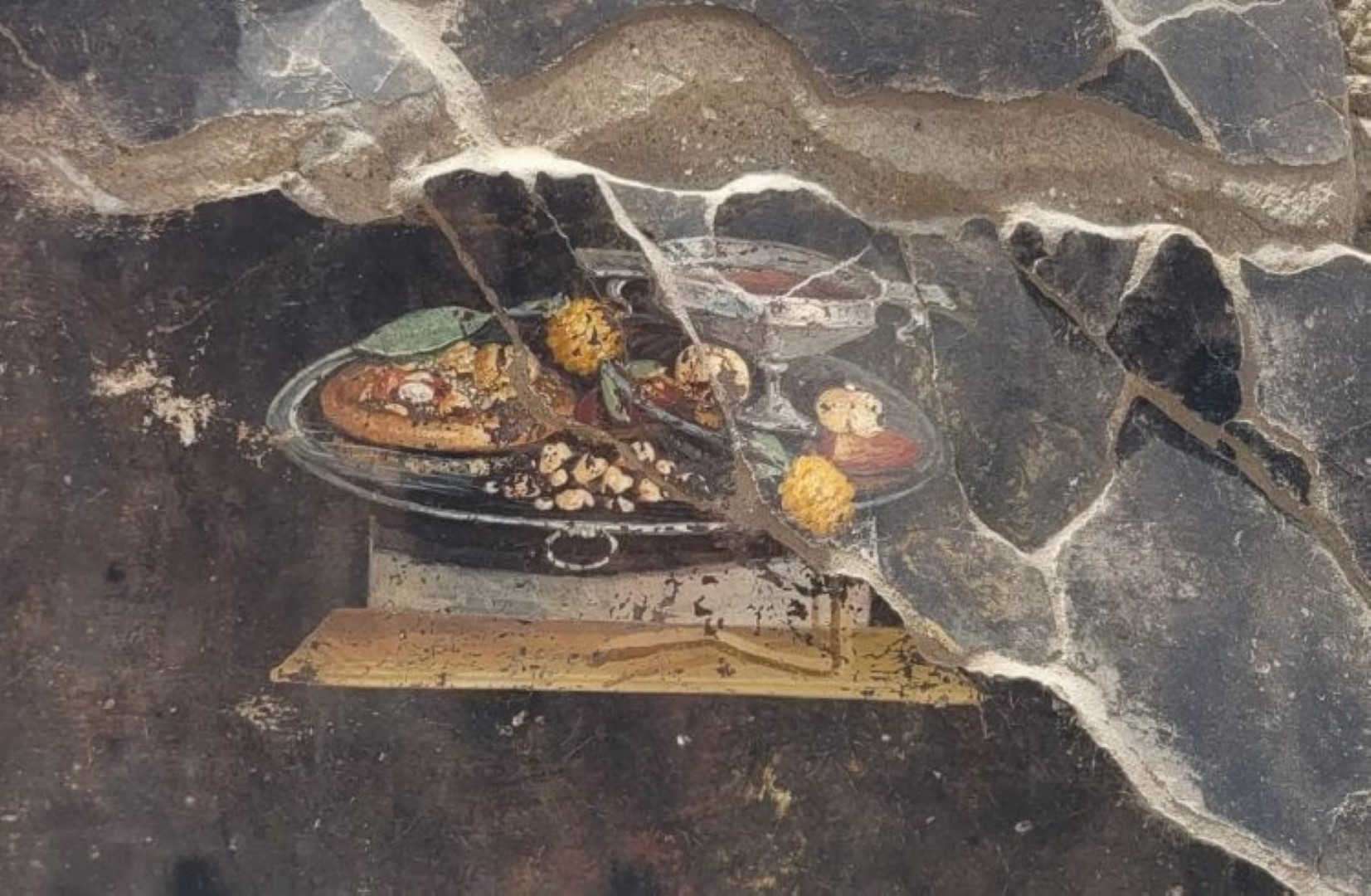 Senoviniame natiurmorte sidabrinėje lėkštėje parodytas maistas: vyno taurė, datulės, granatai ir kitos gėrybės. Šalia mokslininkai pastebėjo ir moretum – tai Senovės Romos laikų užkandis, gaminamas iš sūdyto sūrio, česnako, acto, salierų ir kalendrų. Sudėtimi jis panašus į šiuolaikinį pesto padažą ir dažniausiai buvo valgomas užteptas ant duonos.