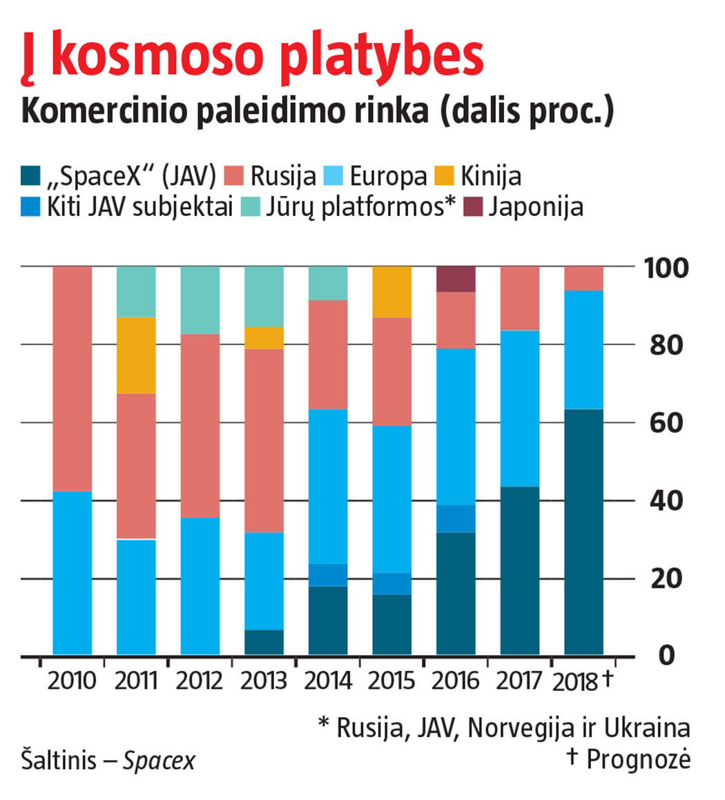 2002 m. įkurta ir 2008-aisiais pirmą raketą sėkmingai paleidusi „SpaceX“ užėmė dominuojamą padėtį komercinių raketų rinkoje (žr. grafiką). 2017 m. ji paleido 18 raketų – daugiau nei kiti JAV subjektai ir Europa kartu. „Falcon 9“, be abejo, yra pigiausia didžioji nešančioji raketa rinkoje iš dalies dėl to, kad tik jos pirmoji pakopa gali grįžti į Žemę tolesniam naudojimui. (Žinoma, problemų neišvengia ir „SpaceX“ – trečioji „Falcon Heavy“ nešančioji raketa rėžėsi į jūrą 500 km/val. greičiu, užuot atsargiai nusileidusi ant jai skirtos baržos.)