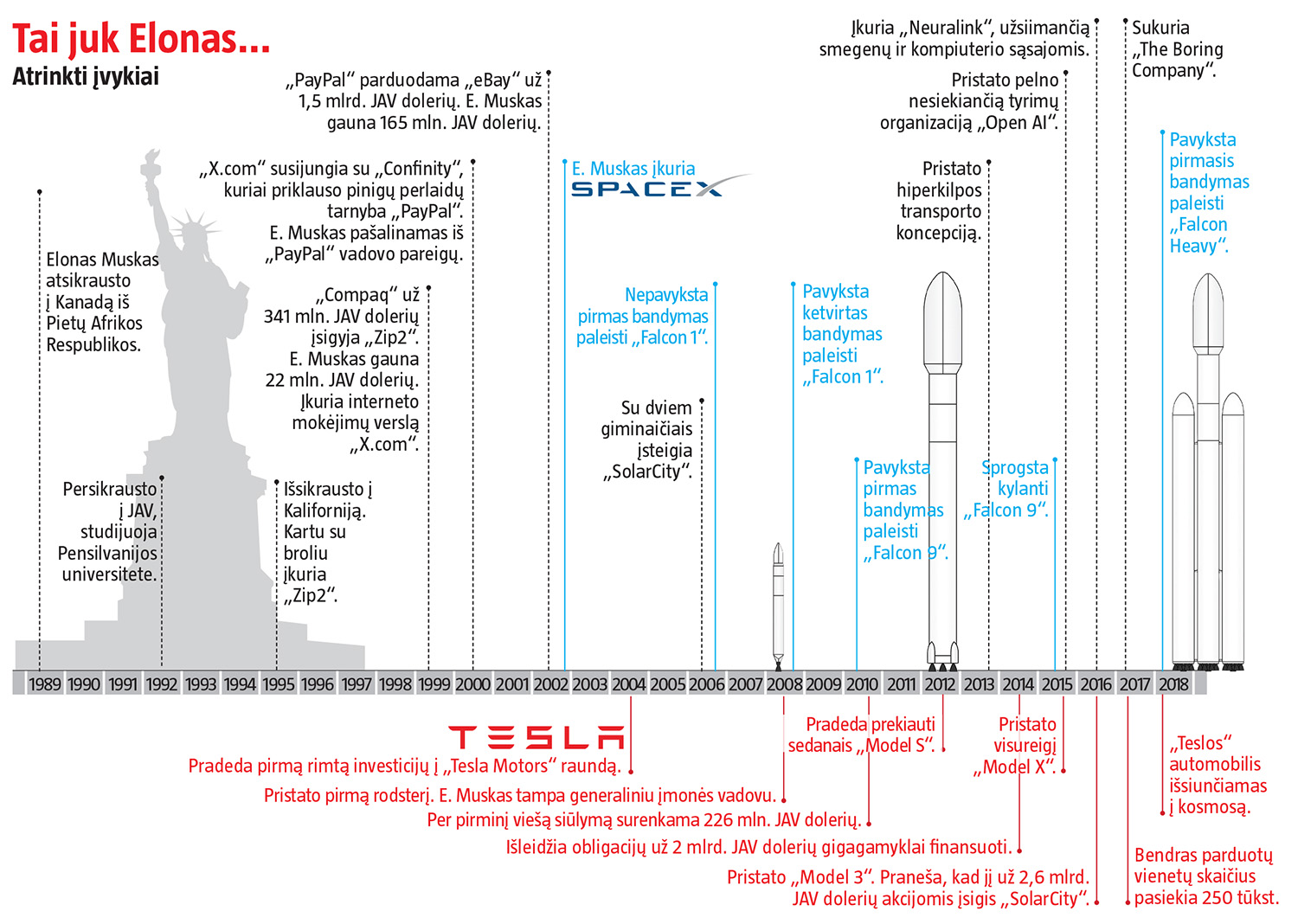 O gal vis dėlto pavyks. 2008 m. ir „SpaceX“, ir „Tesla“ buvo per plauką nuo bankroto. Dabar abi kartu vertos per 80 mlrd. JAV dolerių. Tačiau dėl senų „Teslos“ problemų šiemet E. Musko laukia akistata su didžiausia rizika. Kad būtų aišku, kas pastatyta ant kortos, pažiūrėkime, ką jis jau pasiekė ir ko – dar ne, taip pat aptarkime pasiekimus užtikrinusias savybes.