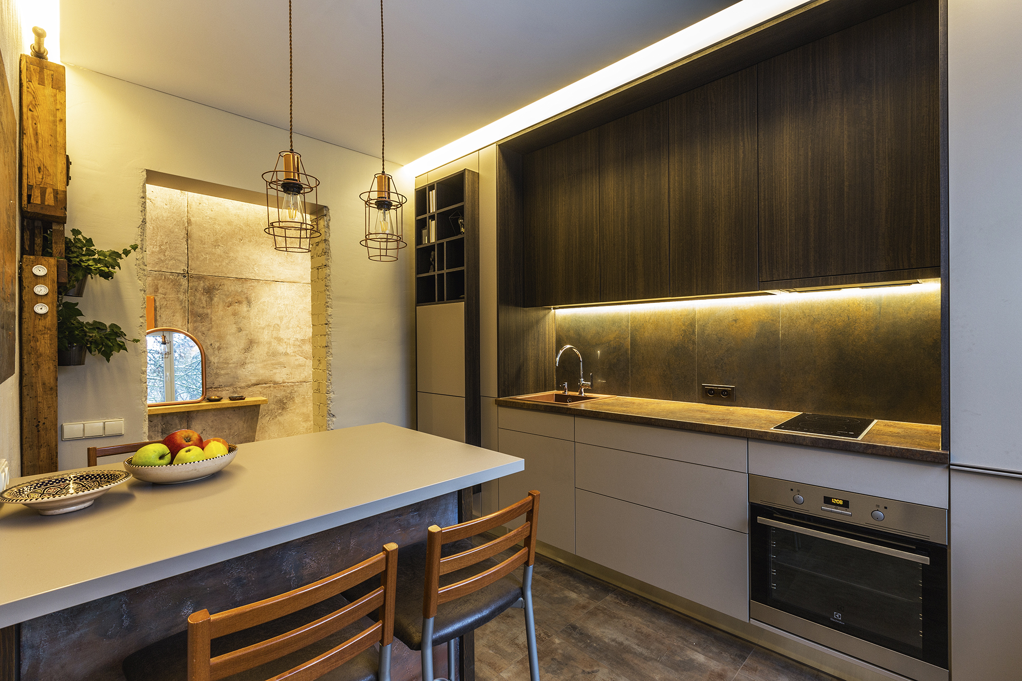Ž. Rakickas nutarė atsisakyti į virtuvę vedančių durų, tačiau erdvės neperplanavo, nejungė su gyvenamuoju kambariu. Atskiroje erdvėje, jo nuomone, lengviau suvaldyti betvarkę. Matinis virtuvės spintelių paviršius derintas su įvairiais būdais išgautu metalo blizgesiu. Tvirtą virtuvinį stalą Ž. Rakickas sumeistravo iš seno baldo ir pritaikė jam metalinį stalviršį.