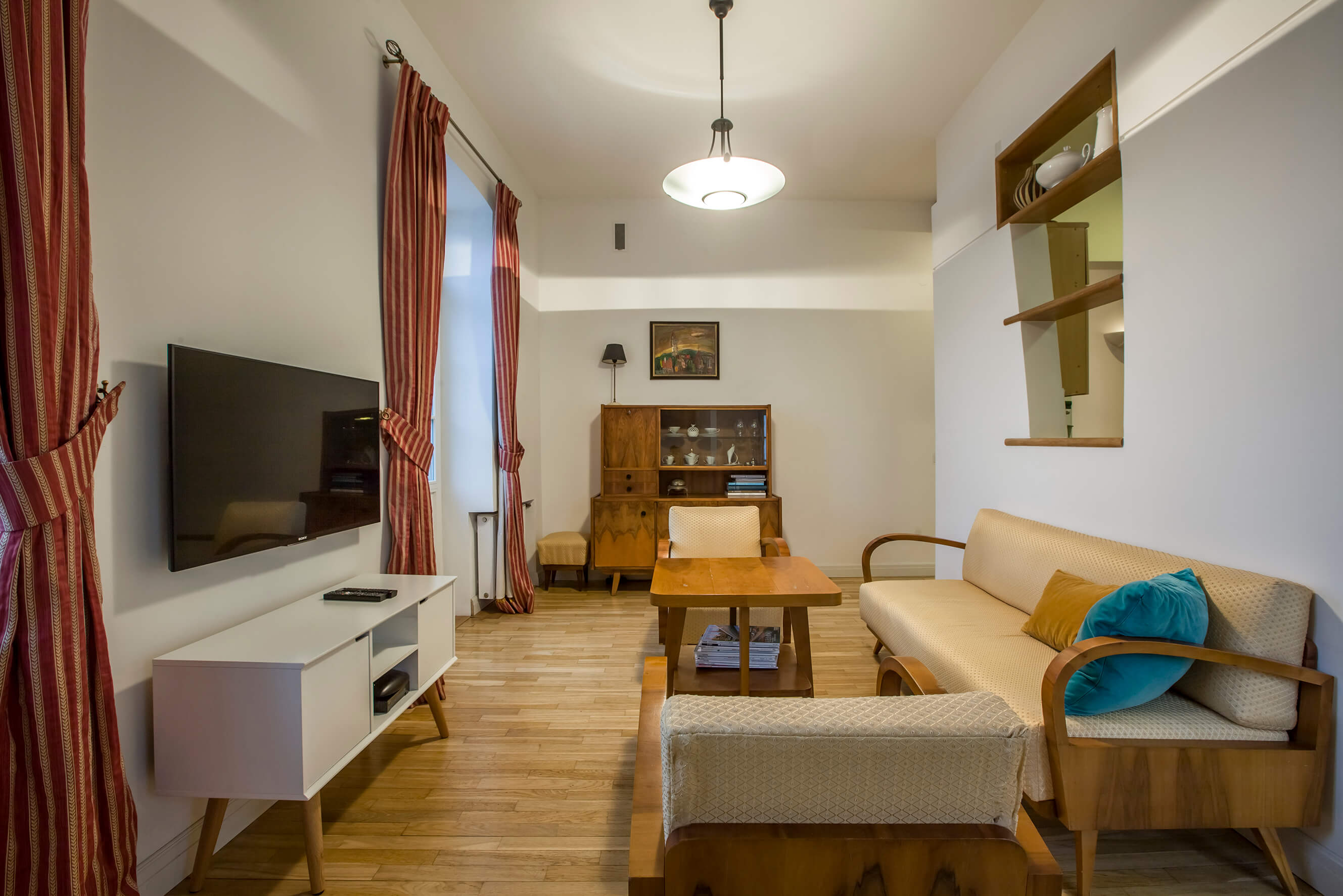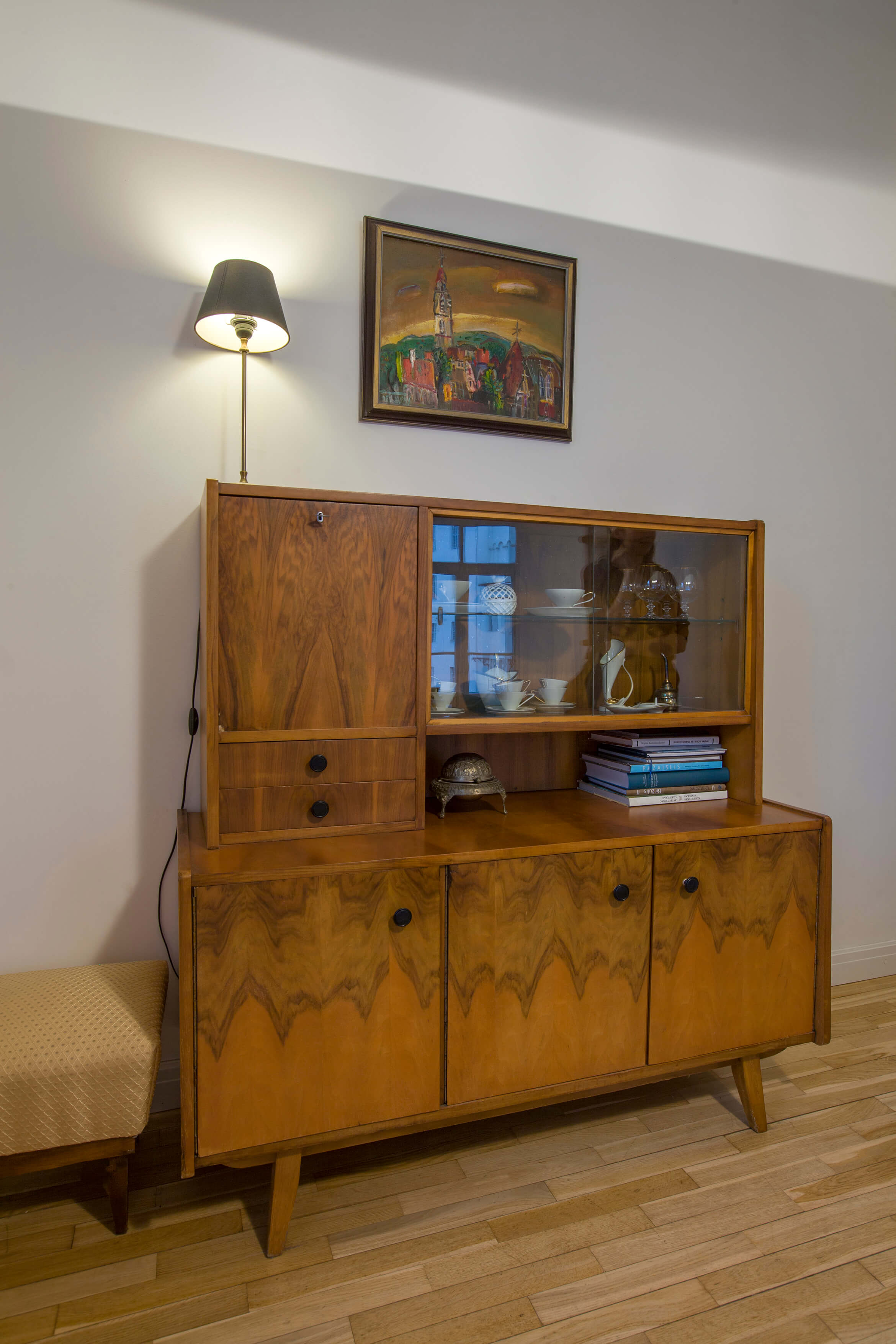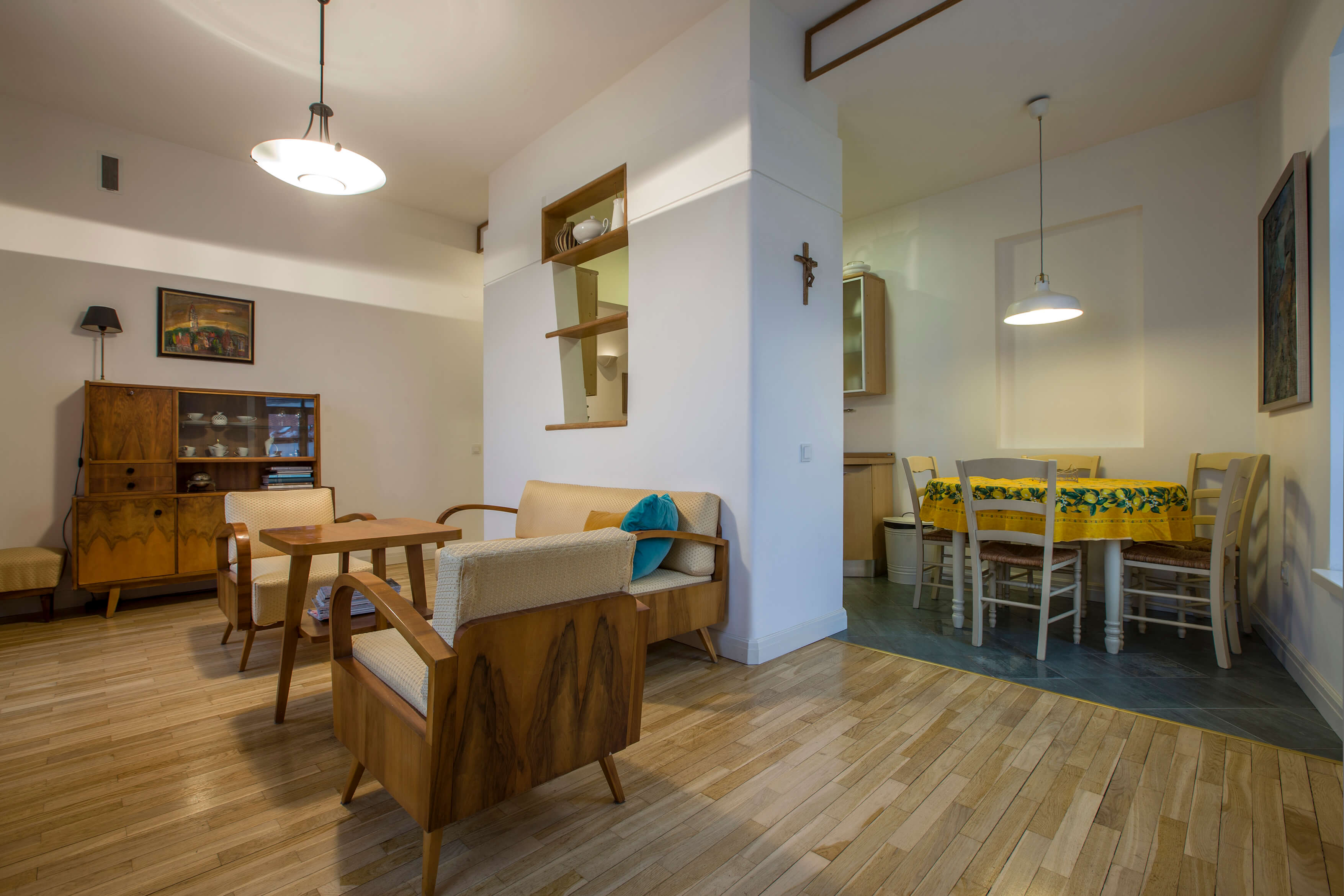 Atgimęs susidomėjimas tarpukario bei XX a. 5–8 dešimtmečių baldais Lietuvoje pastebimas jau kelerius metus. Tai liudija ir specializuotos parodos, ir gausėjančios vintažinių baldų bei aksesuarų prekybos vietos (taip pat šoktelėjusios kainos). Tačiau šiuose namuose beveik visas baldų paveldas yra paveldas tikrąja šio žodžio prasme. Sofos ir fotelių komplektas, keturkampis svetainės stalas, indauja – visa tai atkeliavę iš D. Rimkevičiaus tėvų ir senelių namų. Vilniečiams neprireikė anais laikais alsuojančių baldų ieškoti tikrose ar virtualiose prekyvietėse. Viskas čia – sava, regėta nuo vaikystės, kupina brangių prisiminimų. „Šitie baldai yra matę daug vakarėlių“, – juokiasi sutuoktiniai, kurių namuose svečių šurmulys – taip pat dažnas.