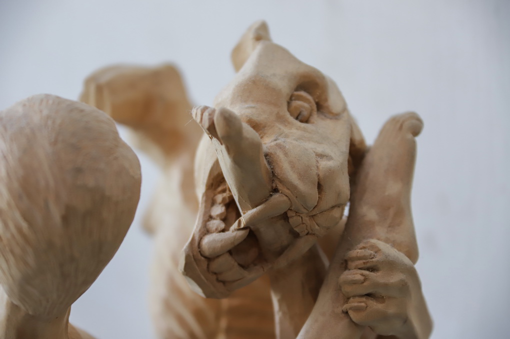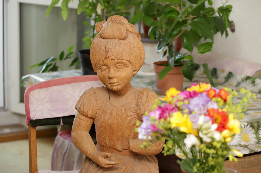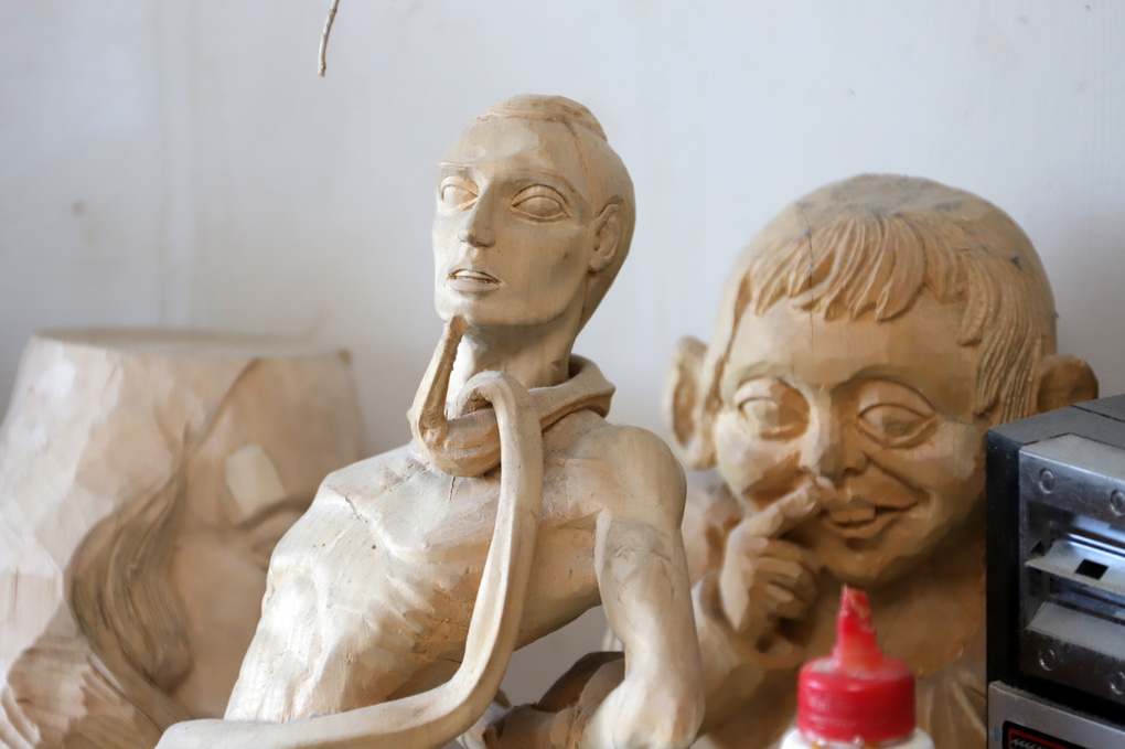 „Tai turėjo būti mergaitė, kuri sėdėtų ant suoliuko ir prie jos vaikai galėtų fotografuotis. Teatras davė ąžuolo, o man liko kojos galas ir rankytė, bet negaliu niekaip pabaigti“, – atsidūsta drožėjas.