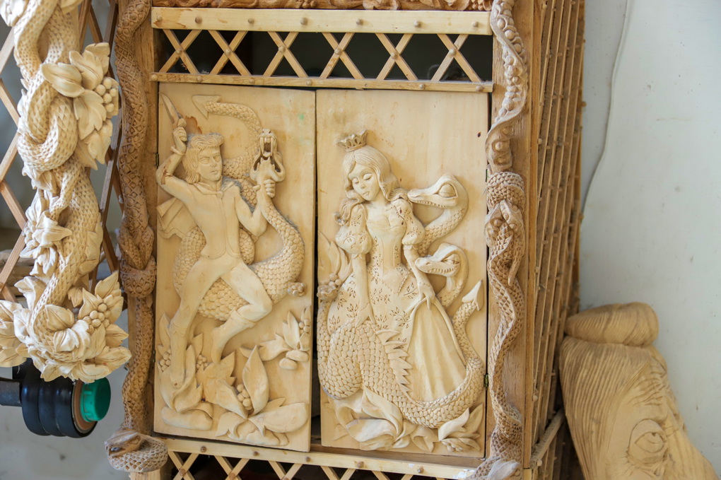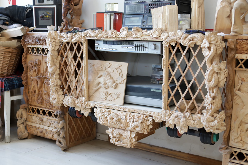 Tačiau ir tai, anot jo, dar ne rekordas. Aktorius jau 30 metų drožiniais dabina spintelę namuose. Įmantriausiais ornamentais papuoštam baldui betrūksta durelių su fragmentais iš pasakų.