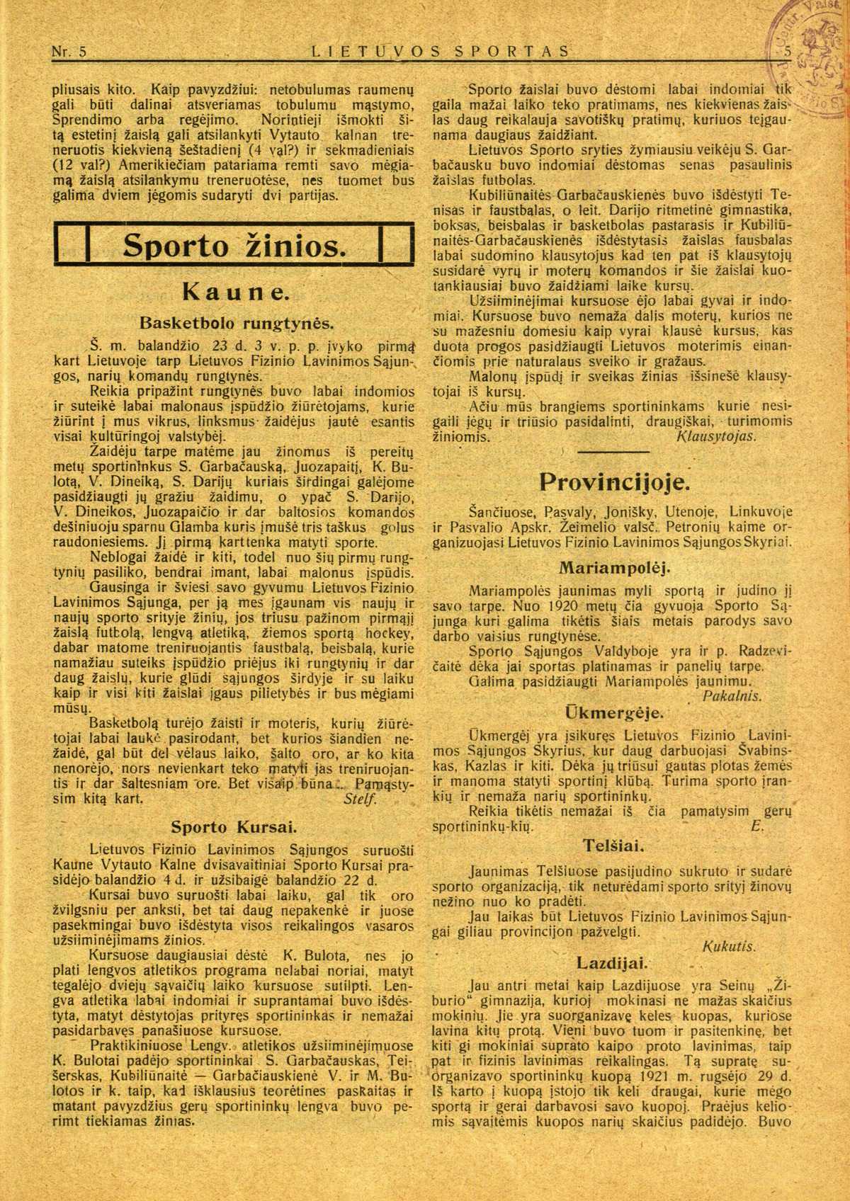 Netrukus dar vienoje pavasarininkų kuopos gegužinėje po krepšiais rungėsi berniukai su mergaitėmis. Berniukai laimėjo 6:4. Tai buvo pirmas paminėjimas, kad ir miesto mergaitės žaidė krepšinį.