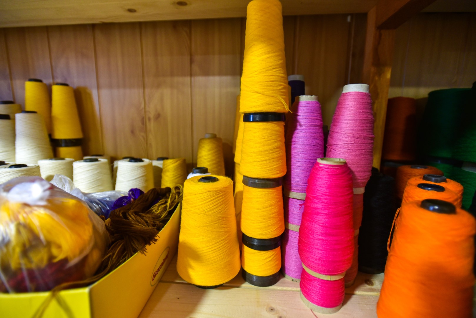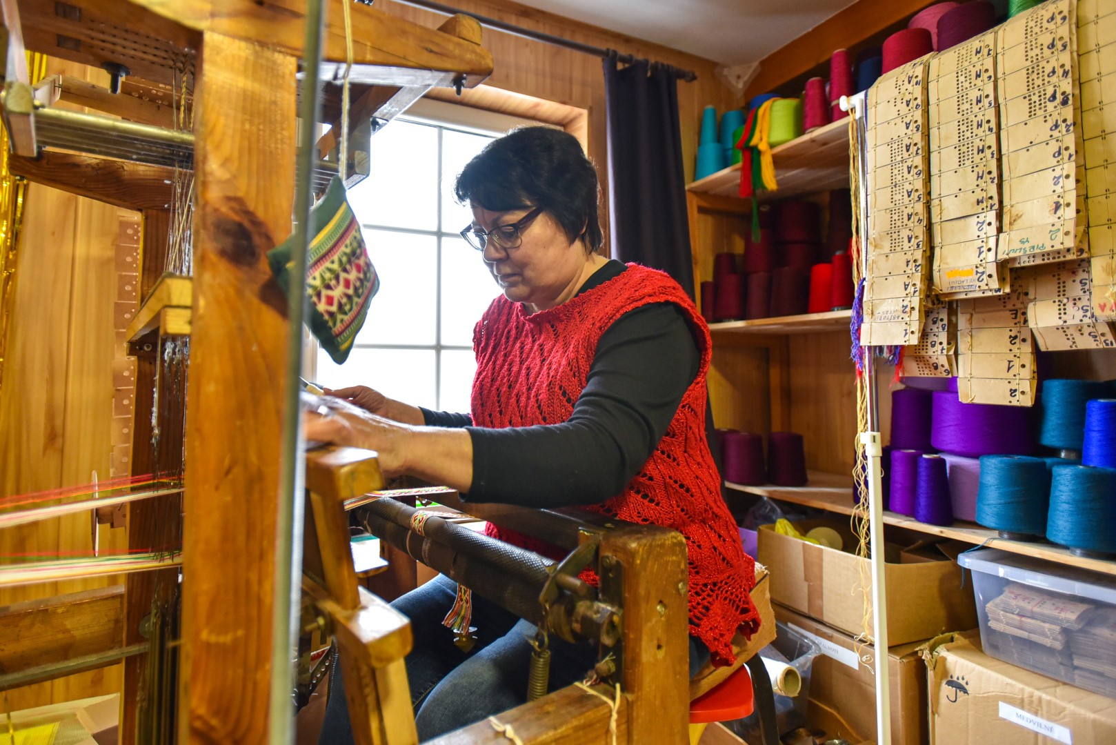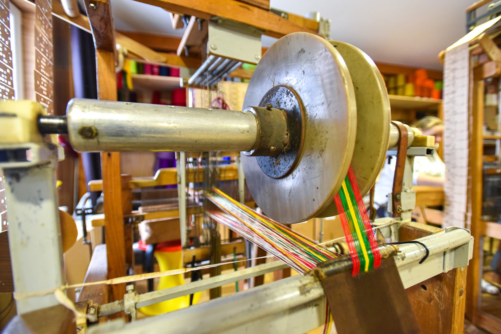 „Tos pačios ruda, žalia, geltona tokios įvairios, turinčios daugybę atspalvių – nuo tamsiausių iki šviesiausių. Štai net salotinės – ir tos turime trijų skirtingų tonų siūlų“, – sako audėja.