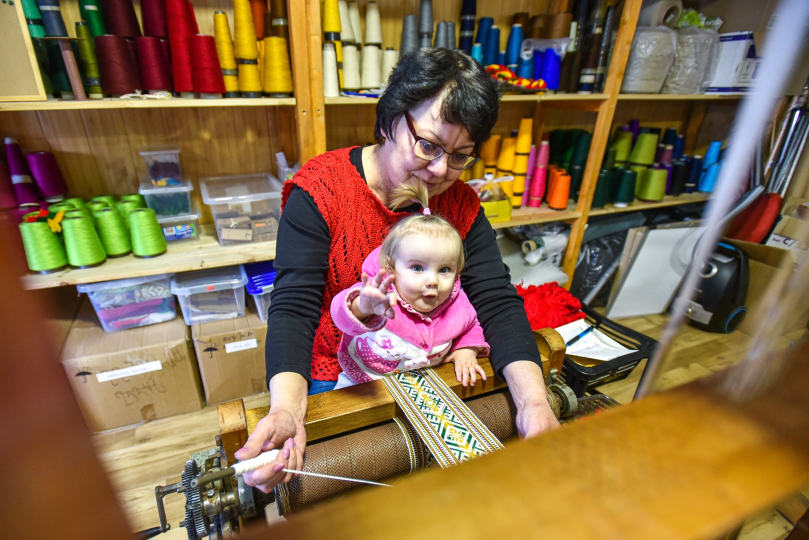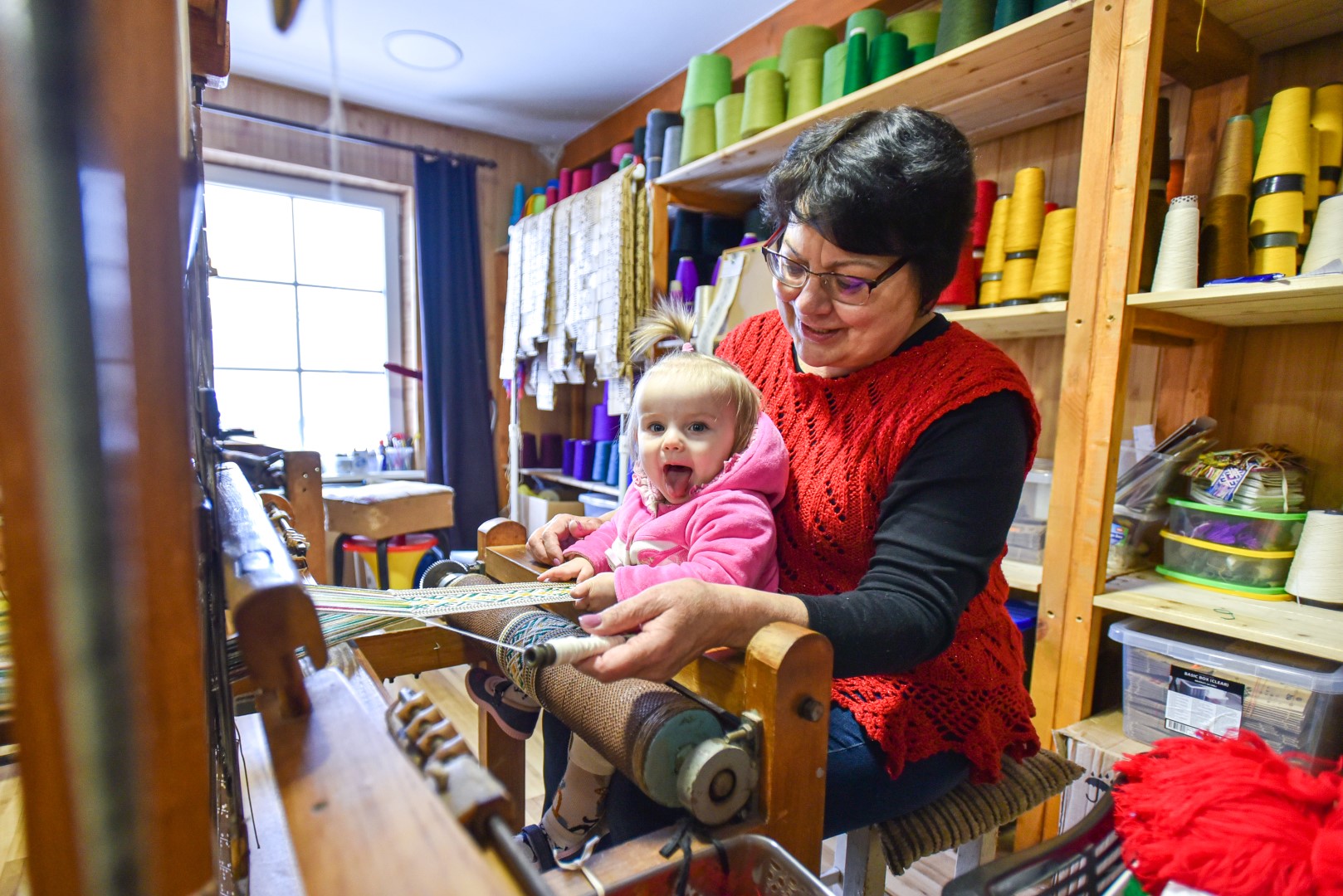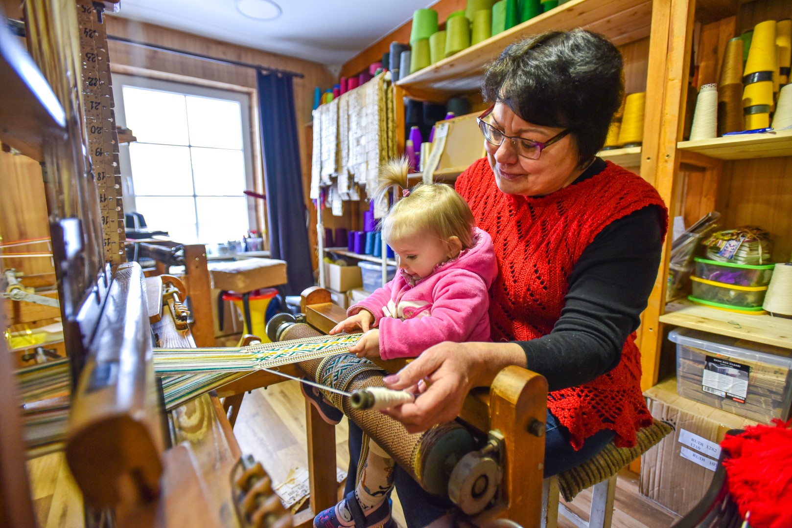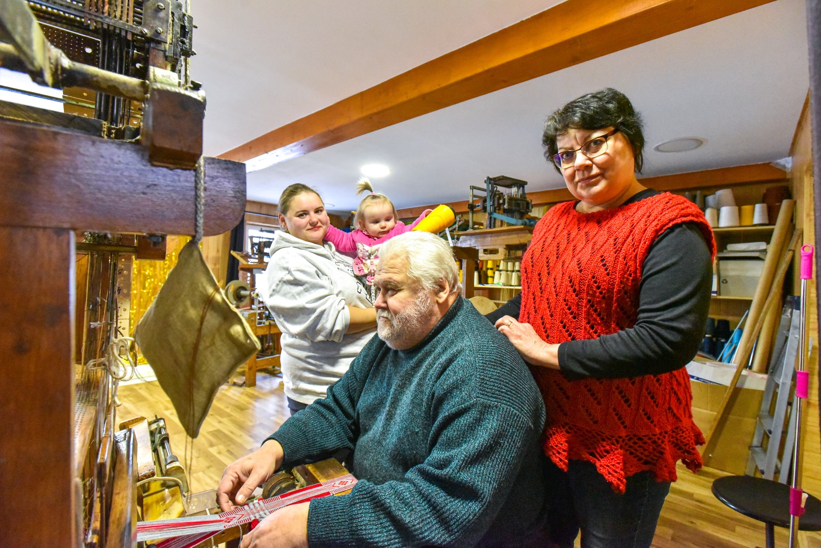Kol mažoji anūkėlė Luknė dar tik apžiūrinėja, kas čia tas kasdien dundantis daiktas, dar tik stebi spalvingų siūlų judėjimą, vienomis staklėmis audžia pati Violeta, kitomis – jos vyras Algirdas Salikas, trečiomis – jų dukra Urtė Salikaitė-Pranckūnienė, Luknės mama.