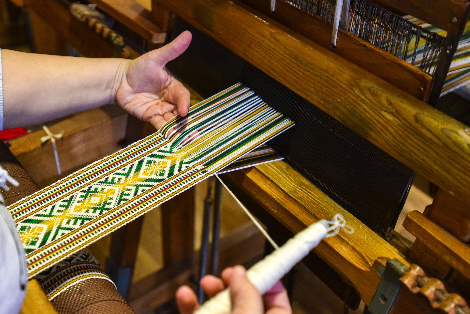 Tautodailininkė juokiasi esanti užburta tos gausybės spalvų, kurias galima įausti į juostas, dėlioti raštus.