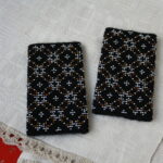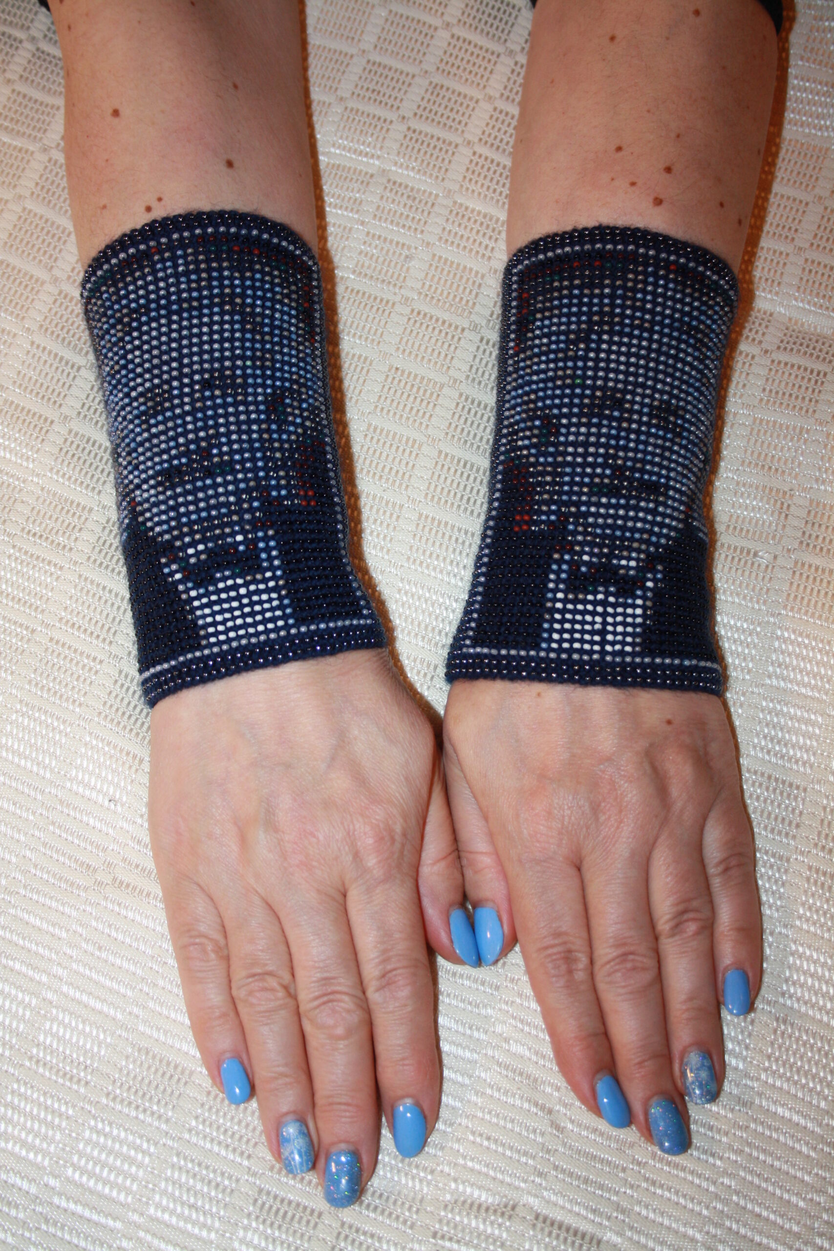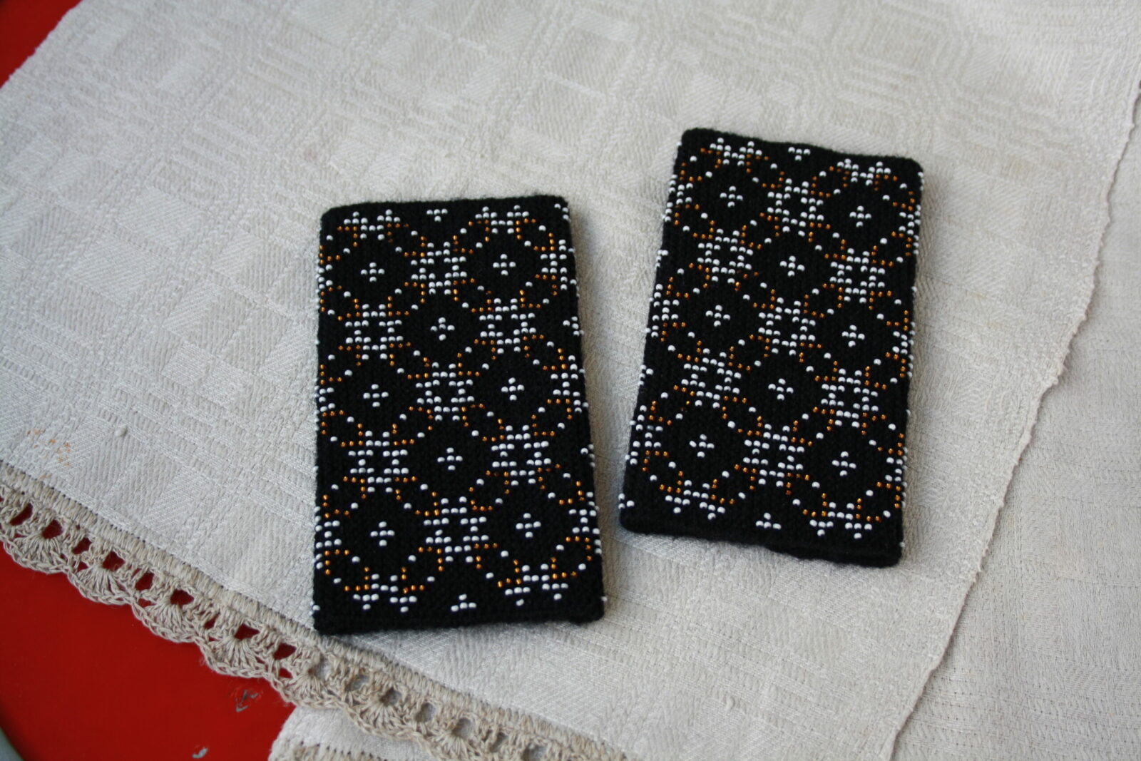 A. Virbalienės megztos solidžių spalvų, tautiniais motyvais smulkiausiais karoliukais siuvinėtos plonytės riešinės įvertintos visos šalies mastu.