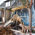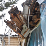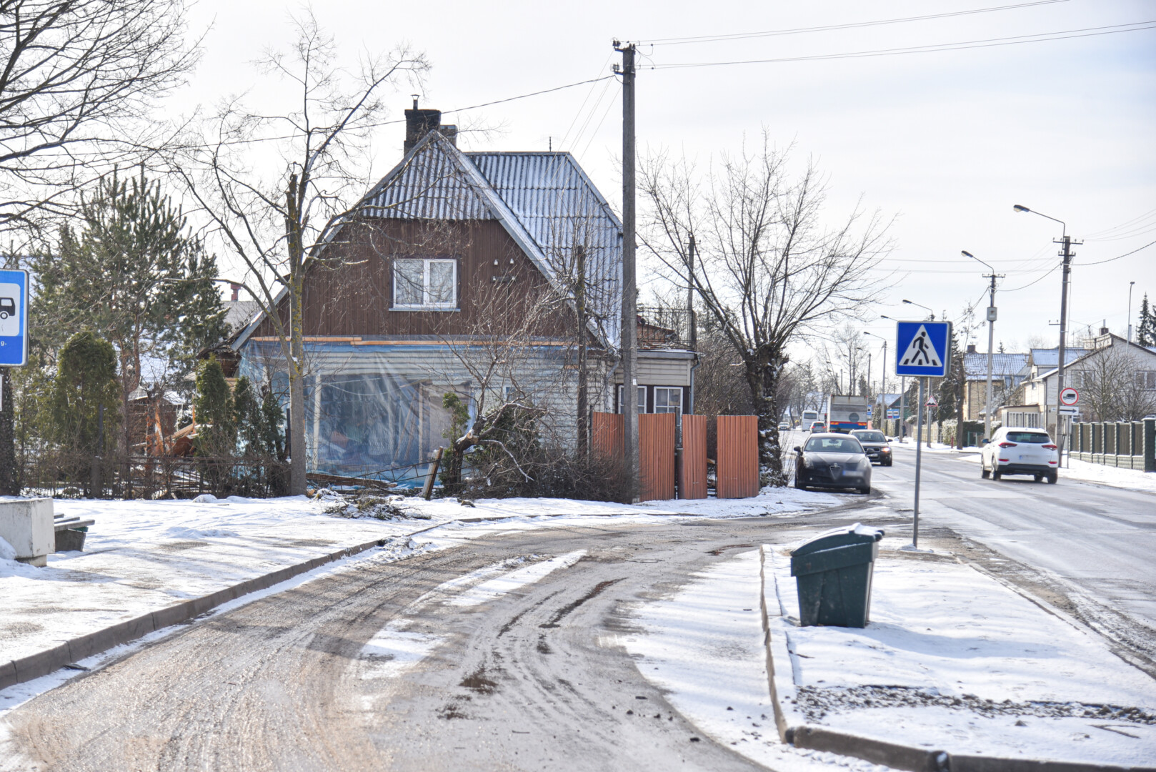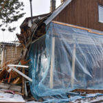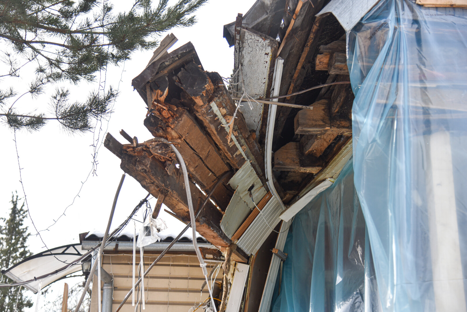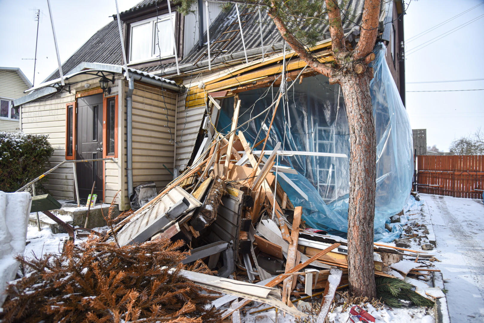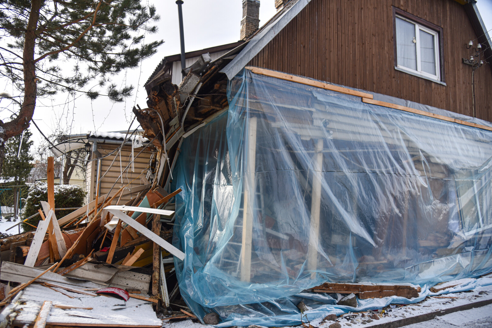 Dabar sugriauto namo dalis aptempta plėve, antrąjį aukštą prilaiko laikinos atramos.