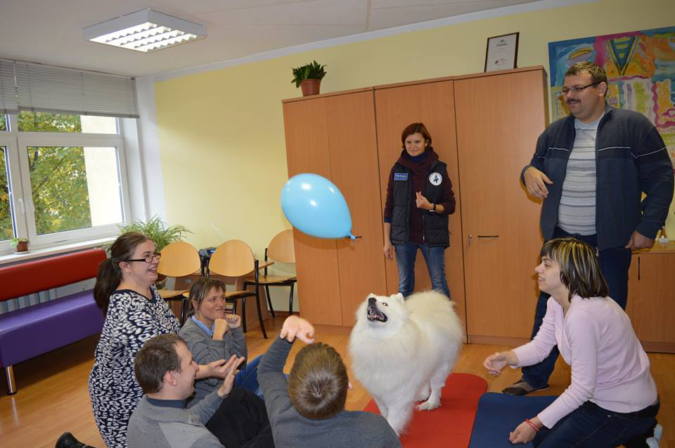 Visus 2016 metus sutrikusio intelekto jaunimą nuolat lankė balta kaip sniegas samojedų veislės kalytė Aika ir jos šeimininkė, Kauno kaniterapinės pagalbos centro atstovė Panevėžyje Solveiga Zaprudskaja. Jaunuolių dienos centro lankytojai labai laukdavo šių popiečių. Pastebėjome, kad bendravimas su šunimis, jų glostymas ir stebėjimas teigiamai veikia emocinę proto negalios žmonių savijautą. Į kasdienišką JDC aplinką įsiliejanti sniego baltumo bičiulė praskaidrindavo dieną, leisdavo atitrūkti nuo rutinos, būti ramesniems, labiau atsipalaidavusiems ir puikios nuotaikos likusią dienos dalį.