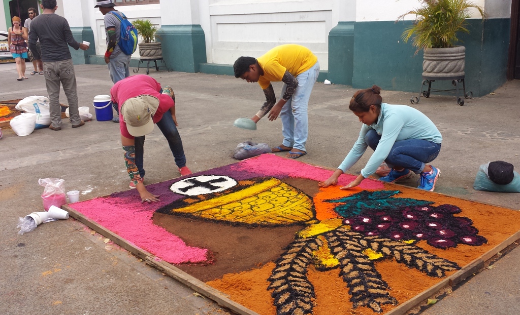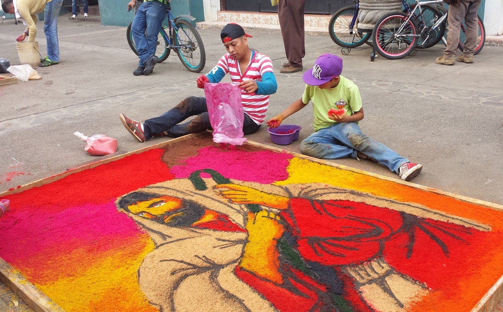 Ne mažiau įspūdinga ir turistus viliojanti pramoga – raštais išmargintų kilimų, gaminamų iš gėlių žiedlapių, spalvotų miltelių ar pjuvenų, klojimas. Kiekvieno universiteto, ministerijos ar privačios įmonės garbės reikalas – puošimui gauti lopinėlį gatvės. Ankstyvą rytą į paskirtą gatvę susirinkę atranką praėję kilimų kūrėjai kruopščiai margina raštus pagal sukurtą ir patvirtintą trafaretą. Kai po kelių valandų kilimai būna baigti, visa gatvė pasipuošia Jėzaus bei Marijos atvaizdais, paskutinės vakarienės, nukryžiavimo ar prisikėlimo scenomis, o kartais tiesiog gamtos vaizdais – papūgomis, drugeliais ar kalnų imitacijomis. Kai kuriuose kilimuose po nukryžiuoto Kristaus atvaizdu puikuojasi ir paveikslą sukūrusios institucijos pavaidinimas – pavyzdžiui, „Švietimo ministerija“ ar „Elektros ūkis“. Tiesa, šių įspūdingų dekoracijų grožėjimuisi lieka tik valanda ar kelios – vakare taku žygiuojanti procesijos minia viską sutrypia. Po procesijos praėjimo gatvės sutvarkomos ir paruošiamos kitos dienos kilimų klojimui.