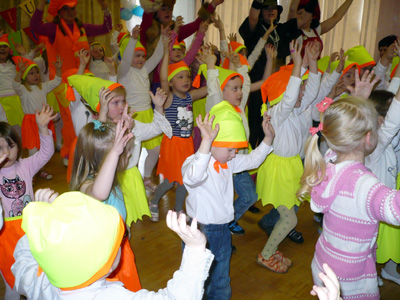 Vasario 26-ąją mūsų pasveikinti atvyko socialiniai partneriai – „Žemynos“ pagrindinės mokyklos mokiniai. Jie parodė nuostabų koncertą. Jame dalyvavo gal net dešimt mūsų darželį lankiusių vaikių. Buvo šokama, skambėjo dainos ir nuoširdūs linkėjimai: „Gyvuokit dar 45 metus!“