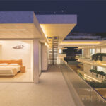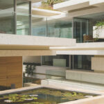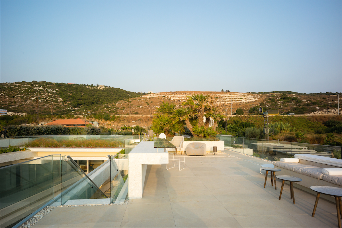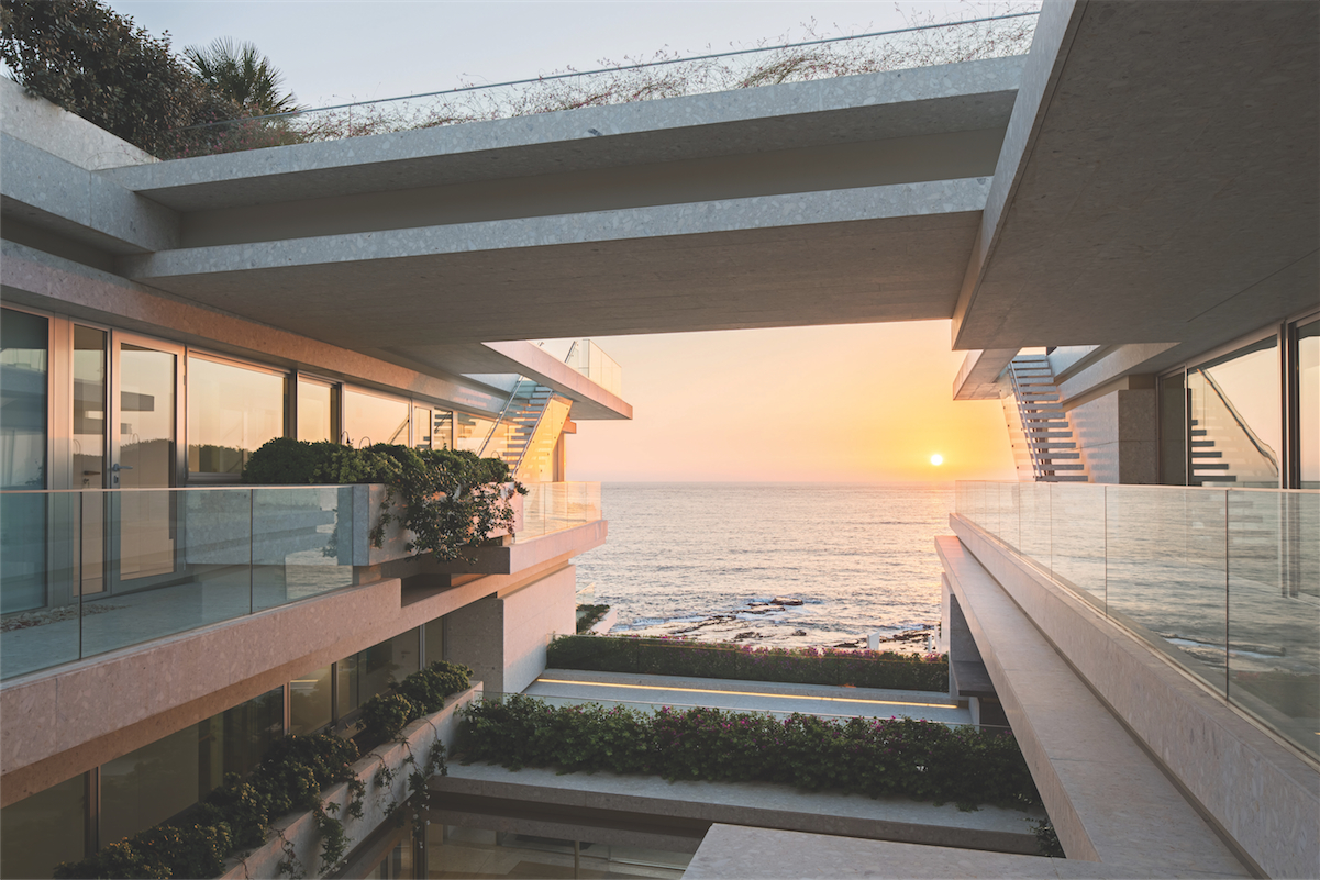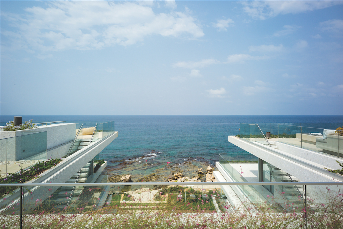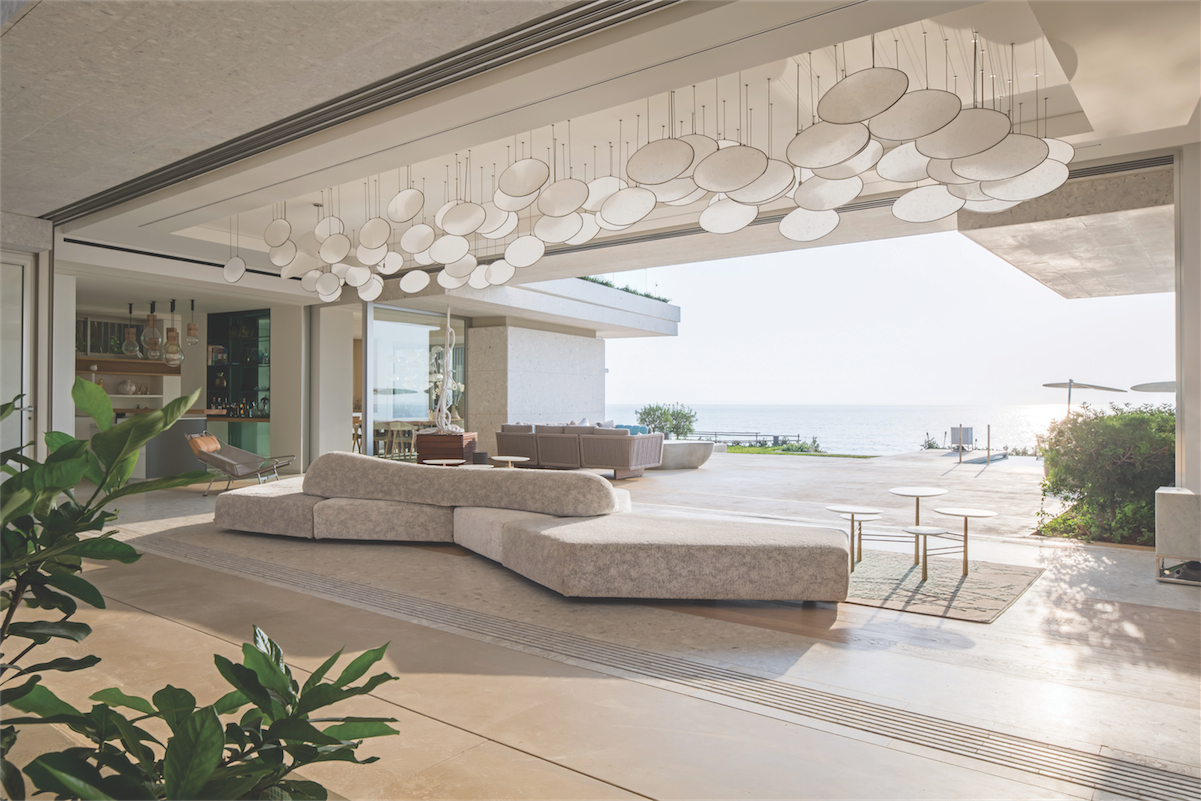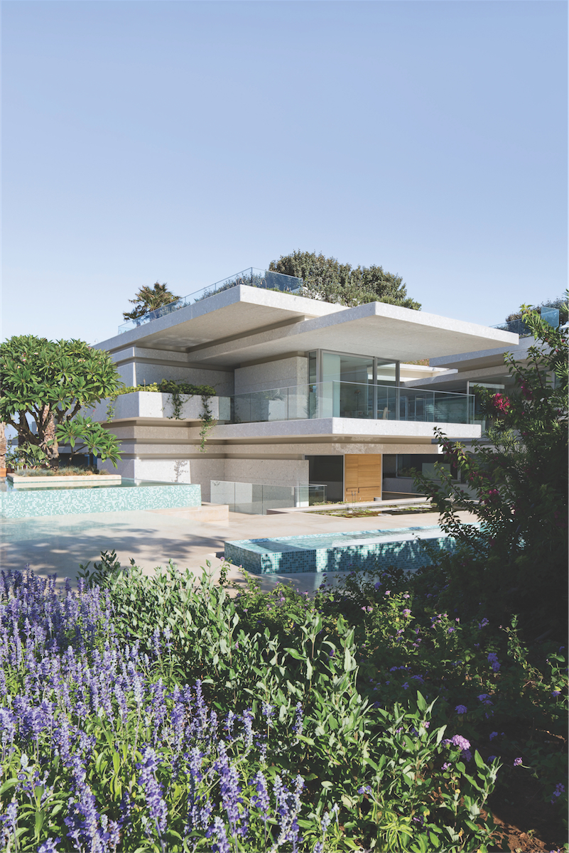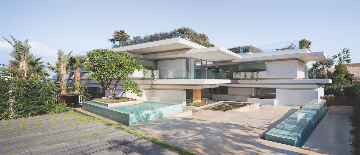 Interpretuodami tradicinio rytietiško namo struktūrą – aplink vidinį kiemelį su fontanu išdėstytas patalpas – vilai jūros pakrantėje kompanijų „BLANKPAGE Architects“ ir „Karim Nader Studio“ architektai šį tradicinį planą tarsi perpjovė pusiau ir atskyrė V raidės forma, kad Viduržemio jūra būtų matoma iš visų namo erdvių. Šiuo tarpekliu, žemyn kaskadomis tarp baseinėlių nuo įėjimo vartų iki pajūryje įrengto sodo, per priėmimų salę leidžiasi akmeniniai laiptai. Stiklinės salės sienos prireikus sustumiamos ir taip suformuojama jūros brizams atvira, tačiau nuo lietaus ir kaitrios saulės apsaugota erdvė, tinkama mėgautis bet kuriuo metų laiku.