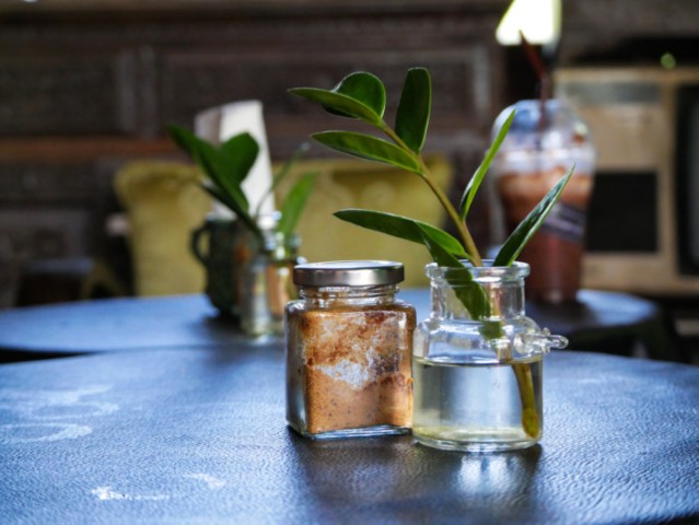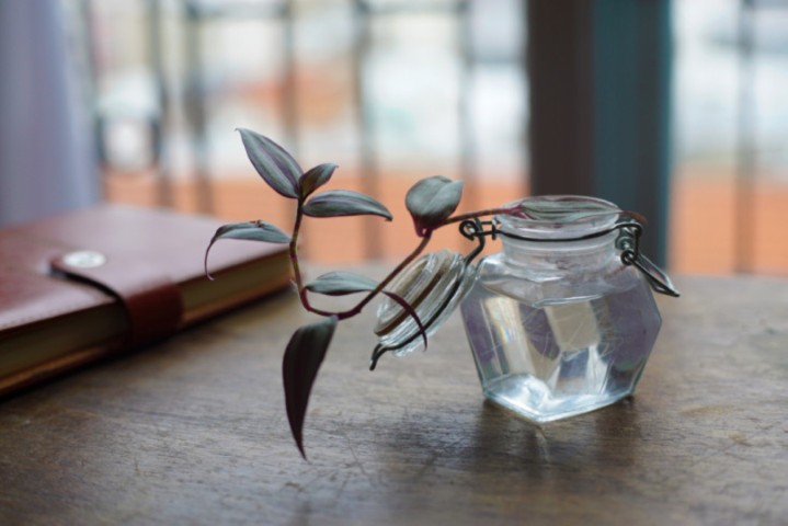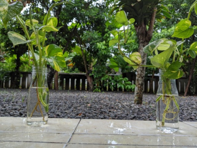Bet yra ir kitas būdas tą padaryti – nupjauti auginį ir maždaug trečdalį jo panardinti į vandenį. Visai netrukus apatinėje nupjauto stiebo dalyje pasirodys šaknys, o toliau laikant skystyje – ir jauni ūgliai.