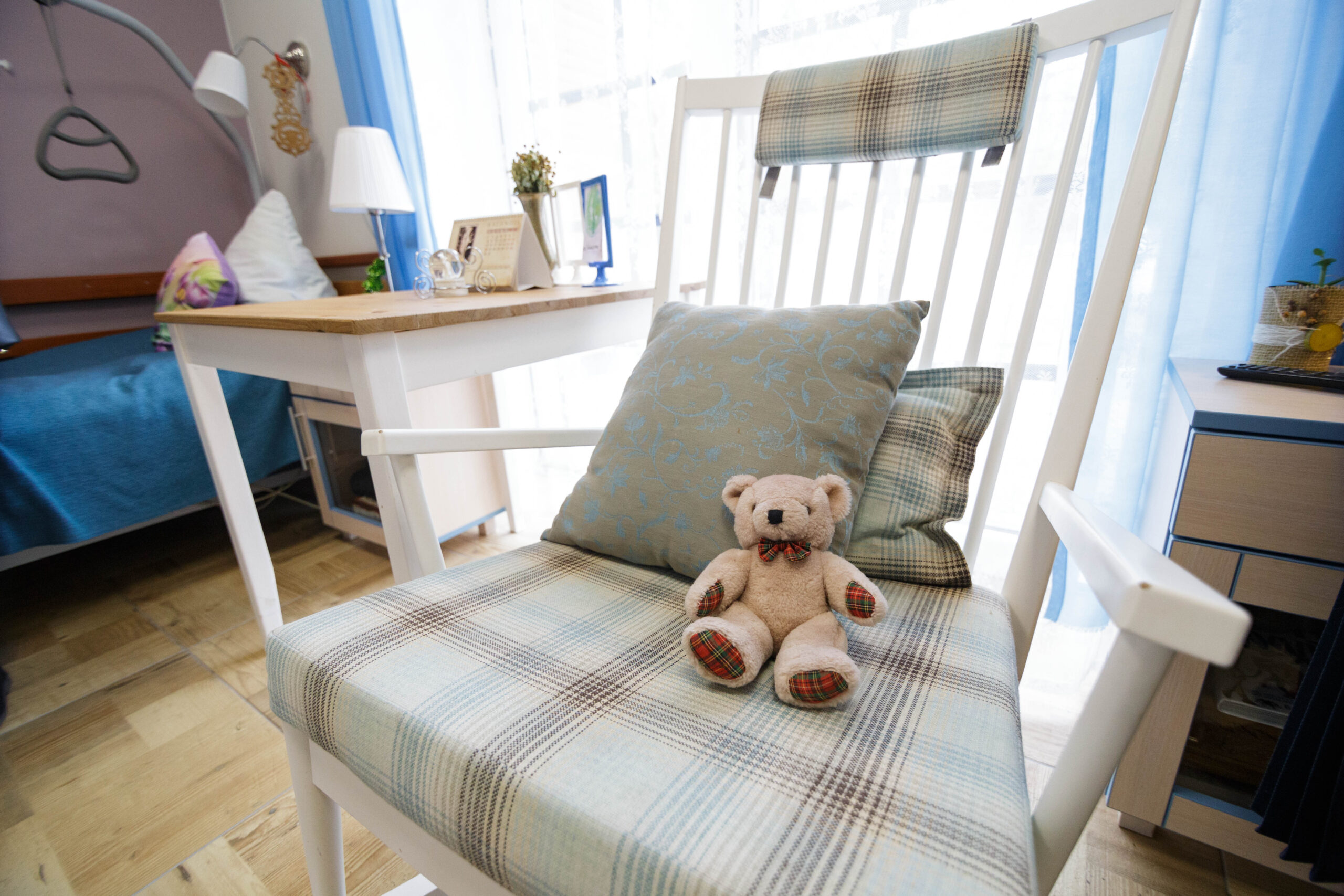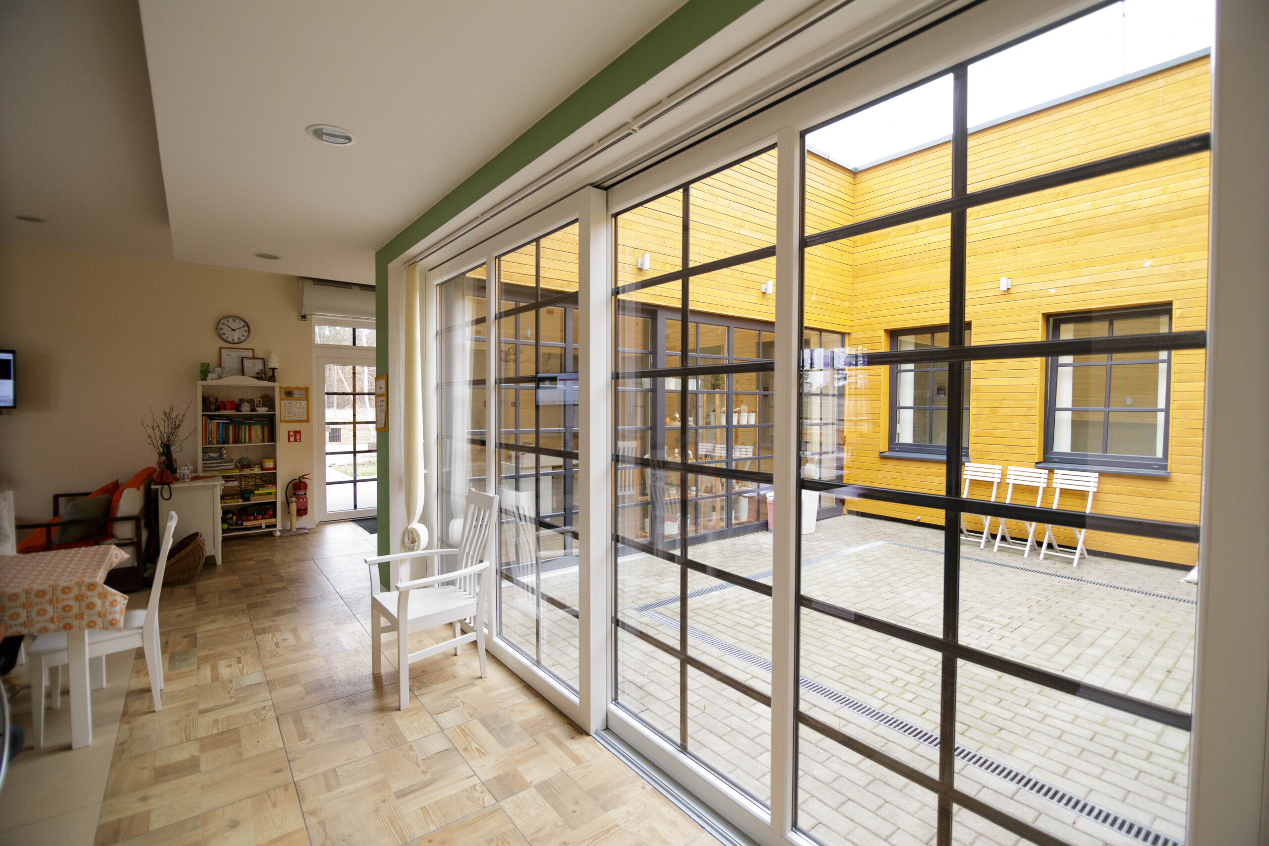 Gyvenamosios patalpos nė iš tolo neprimena ligoninės palatų – visur be galo jauku, žaisminga ir spalvinga. Iš kambario, atvėrus žemę siekiančius langus, galima išeiti į kiemelį. Tiesa, iš daugelio kambarių jau patenkama tik į uždaras terasas, mat pasitaikydavo atvejų, kai močiutės sugalvodavo išeiti pasivaikščioti neprižiūrimos.