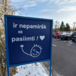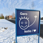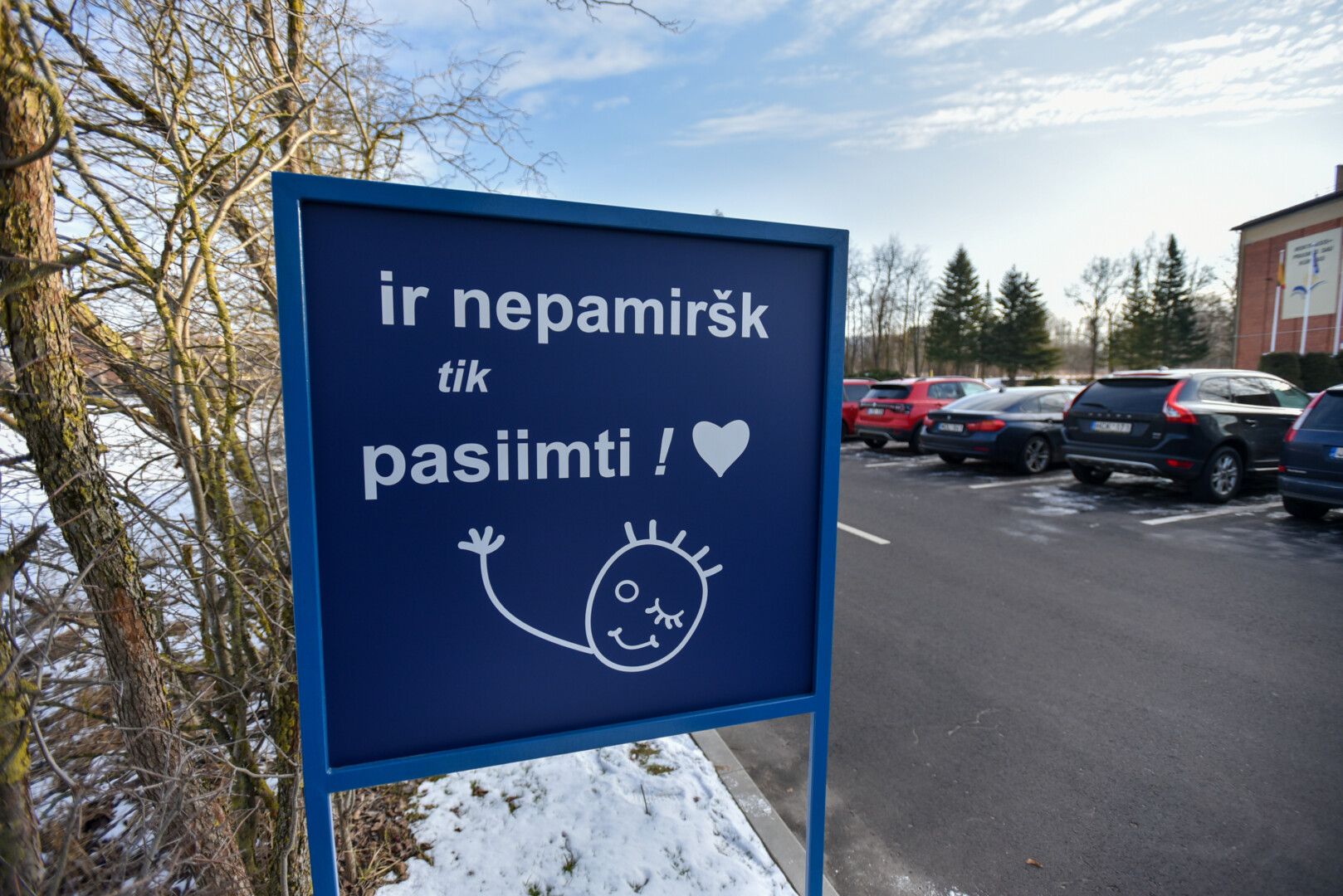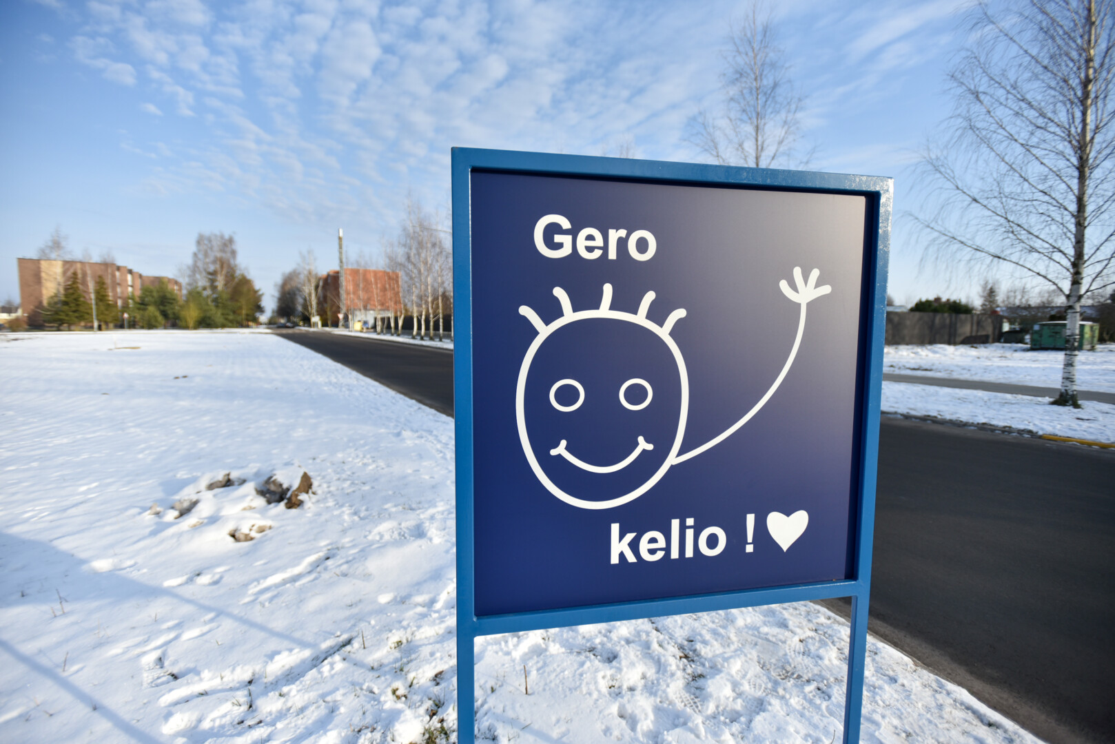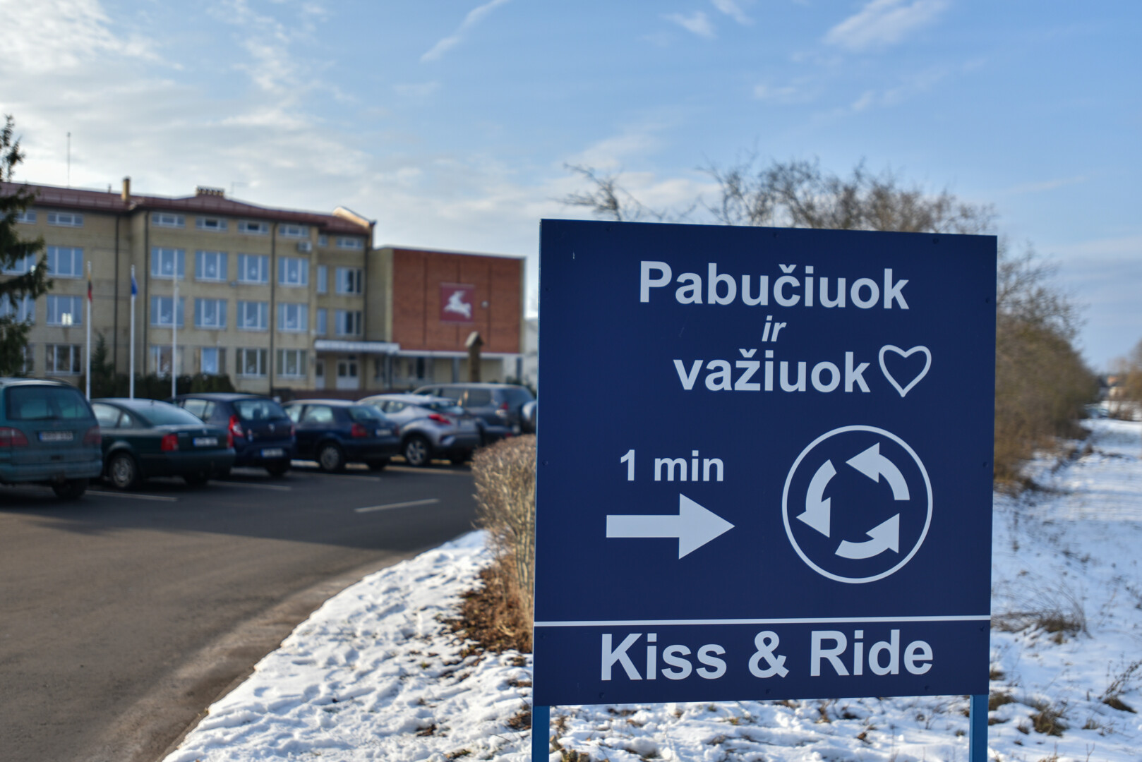 Prie įvažiavimo į mokyklos kiemą iš tolo šviečia mėlynas ženklas „Pabučiuok ir važiuok“, o išvažiuojant ne tik palinkima gero kelio, bet ir primenama nepamiršti pasiimti vaikų po pamokų.