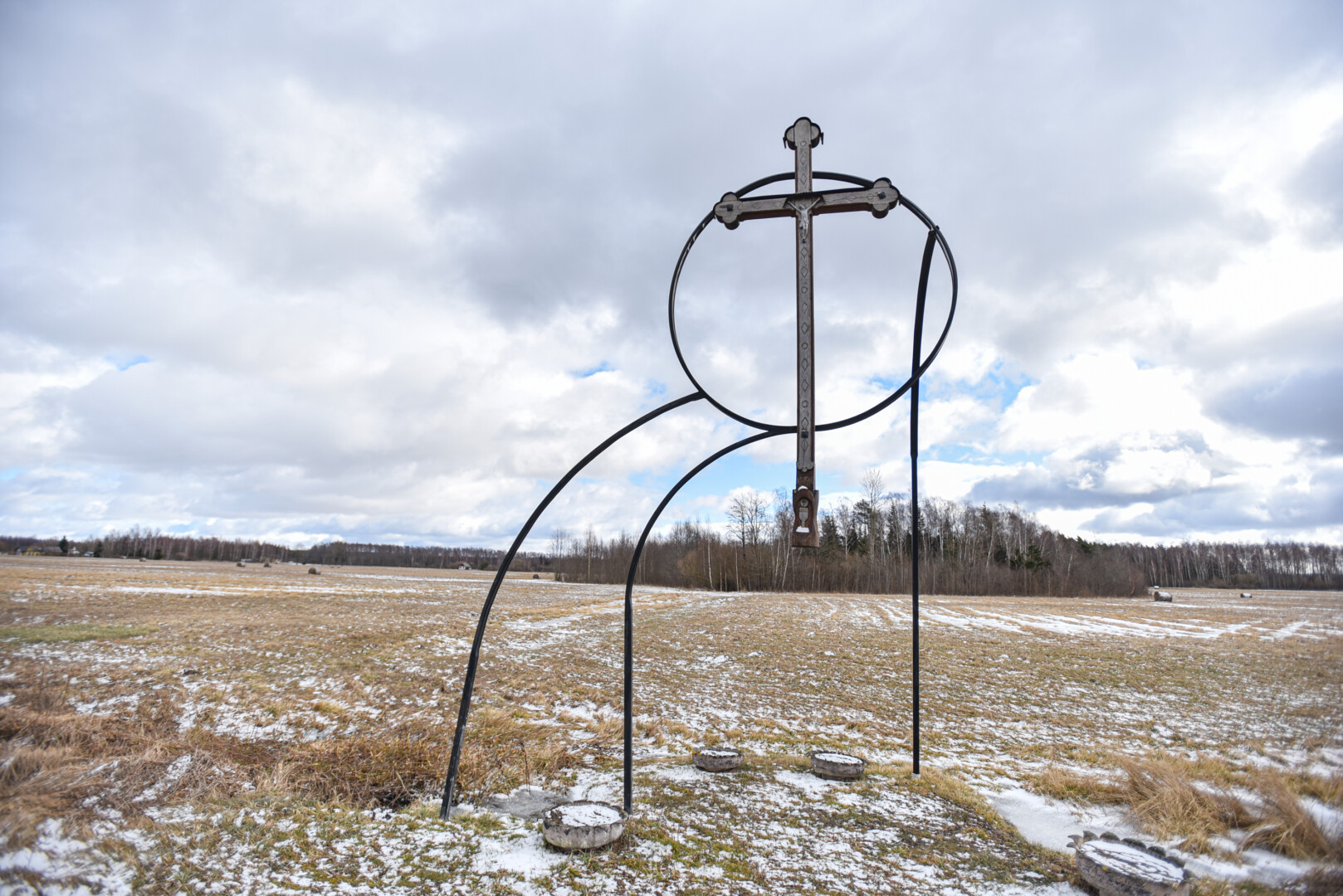 Nuo Skaistgirių pasukus Paįstrio link, akis nebejotinai užkliūva už išskirtinio, ant metalinių konstrukcijų iškelto kryžiaus.