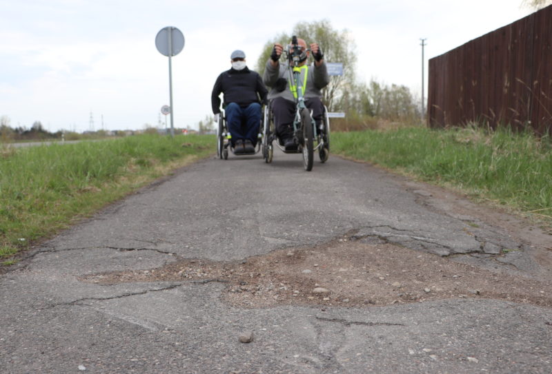Pirmadienio vakarą Panevėžio krašto žmonių su negalia sąjungos (PKŽNS) atstovai atliko netradicinį bandymą. Neįgaliųjų vežimėliais organizacijos pirmininkas Jonas Dumša ir darbuotojas Žilvinas Kliopmanas leidosi dviračių ir pėsčiųjų taku palei magistralę Panevėžys–Pasvalys–Ryga į Piniavą. Kelionė buvo ne tokia lengva, kaip galėtų atrodyti jos neišbandžiusiems.